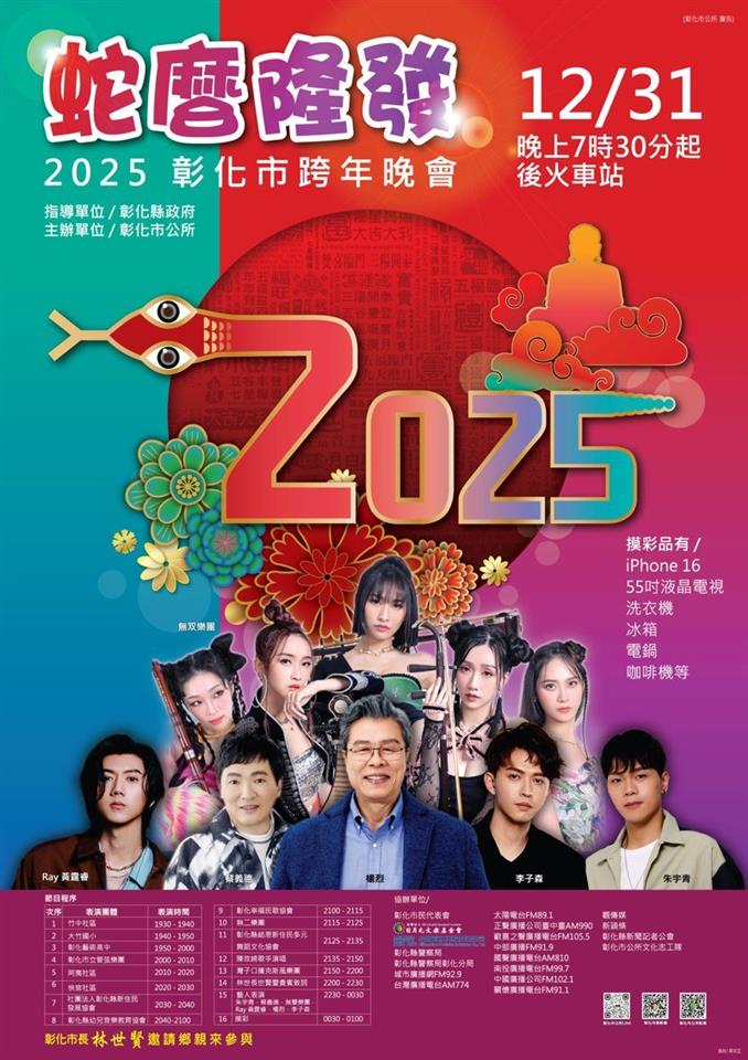 其他資訊 彰化市公所「2025彰化市跨年晚會」 歷史訊息 | 發布日期: 2024/12/19~2024/12/31 | 瀏覽人數: 16440人 為迎接2025年「蛇年」,彰化市公所定12月31日晚上7點30分起,在後火車站辭修路舉辦跨年晚會,邀請超偶冠軍李子森、鋼琴王子黃霆睿、無雙樂團等多組卡司接力演唱,還有金曲歌王楊烈陪著一同倒數,還有摸彩助興,市長林世賢邀請鄉親跨年同歡。