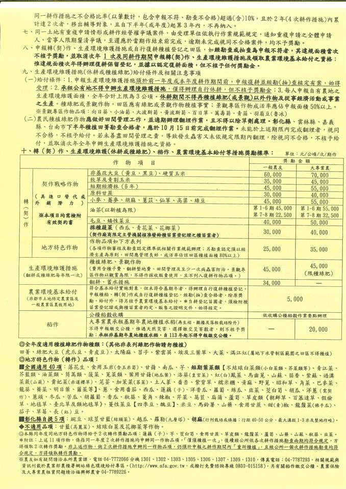 最新公告 本所辦理114年「對地綠色環境給付計畫」(轉契作休耕自行復耕)及福興鄉農會(公糧)聯合下鄉申報表業已排定 歷史訊息 | 發布日期: 2024/12/20~2025/02/08 | 瀏覽人數: 764人 依據:農業部農糧署114年「對地綠色環境給付計畫」辦理。公告事項一、申請期程:1月2日至2月8日。(1月25日至2月2日春節連休暫停受理)二、申請地點:本所1樓農業課櫃檯或各下鄉受理期程及地點(詳如附件)。三、申請時間:上午8時30分至11時30分;下午1時00分至4時00分。四、申報應備文件:申請人身分證或戶口名簿正本、印章、存摺、所有權狀正本(或三個月內土地謄本)、承租用地合法證明詳如附件。五、更多注意事項詳如附件宣導單,請 貴單位周知農民依規申請,避免向隅。六、特別注意事項:一次申報兩期作,若顛倒期作種植申報作物亦以不合格判定,請加強宣導。