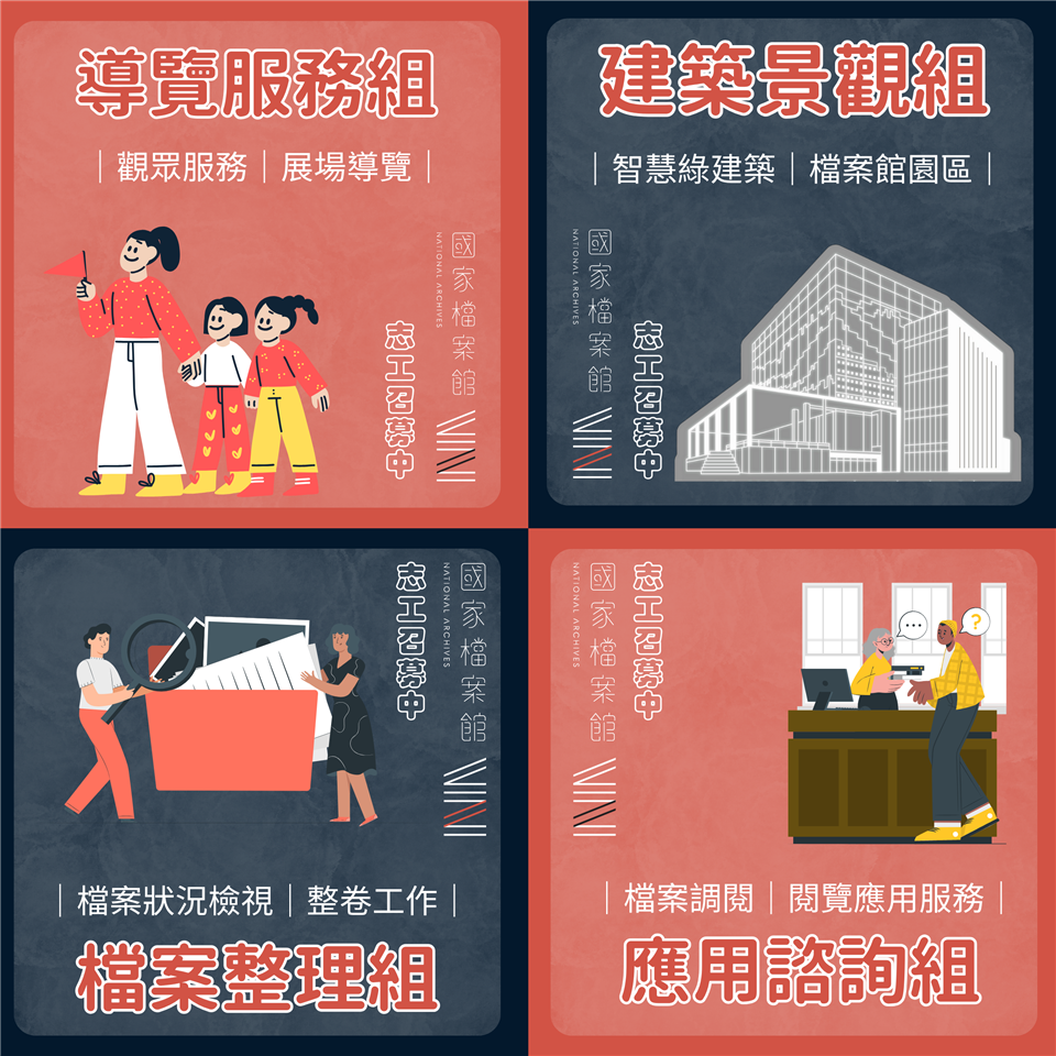 其他資訊 國家發展委員會檔案管理局辦理「國家檔案館114年志工召募簡章」 歷史訊息 | 發布日期: 2025/07/17~2025/08/17 | 瀏覽人數: 46人 一、檔案局為發揮國家檔案價值與教育文化功能,鼓勵熱心人士投入國家檔案館志工行列,參與各項檔案服務工作,實現社會公益,特辦理志工召募,說明如下:(一)報名資格:年滿18歲以上、75歲以下,國中以上學校畢業。(二)報名組別:導覽服務組、建築景觀組、應用諮詢組及檔案整理組。(三)報名方式:1、系統報名:請至國家檔案館志工報名系統(網址:https://gov.tw/5tK)填寫報名資訊。2、電郵報名:請填復報名表並以電郵寄至schiang@archives.gov.tw,信件主旨請敘明「報名國家檔案館志工」。(四)報名時間:1、第一梯次:報名導覽服務組、建築景觀組、應用諮詢組志工者,於本(114)年7月25日截止受理報名。2、第二梯次:報名檔案整理組志工者,於本年9月19日截止受理報名。3、第三梯次:未及於前揭時限報名各組別者,於本年11月21日截止受理報名。二、如有其他詢問事項,請逕洽檔案局企劃組江小姐(電話:02-89955220)。
