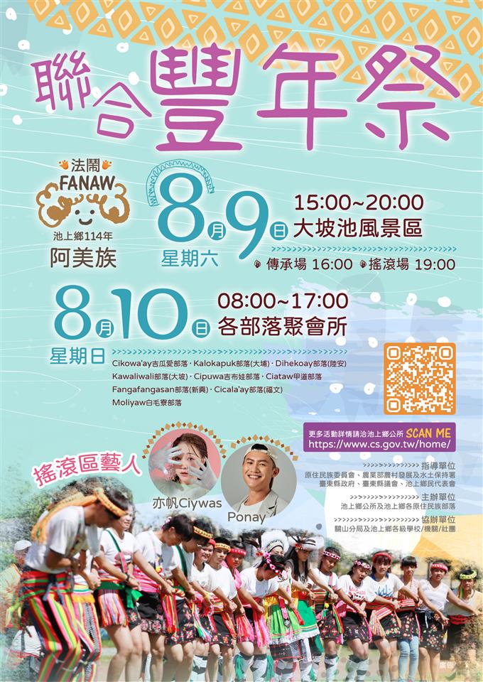其他資訊 「池上鄉114年阿美族聯合豐年祭」活動 歷史訊息 | 發布日期: 2025/07/21~2025/08/10 | 瀏覽人數: 77人 一、池上鄉為了促進本鄉原住民族歲時祭儀文化發展,使各族群能深耕自身族群祭儀文化知識,並強化與青年及族人間連結,提升本鄉族人傳承文化的能量。二、活動資訊如下: (一)池上鄉114年阿美族聯合豐年祭 1.活動日期:114年8月9日(六) 2.活動時間:下午15:00至下午20:00 3.活動地點:池上鄉大坡池 (二)池上鄉114年阿美族聯合豐年祭-各部落豐年祭 1.活動日期:114年8月10日(日) 2.活動時間:早上8:00至下午17:00 3.活動地點:池上鄉各部落聚會所三、活動相關資訊請逕上本所官網https://www.cs.gov.tw/home/或臉書粉專(臺東縣池上鄉公所)查詢。