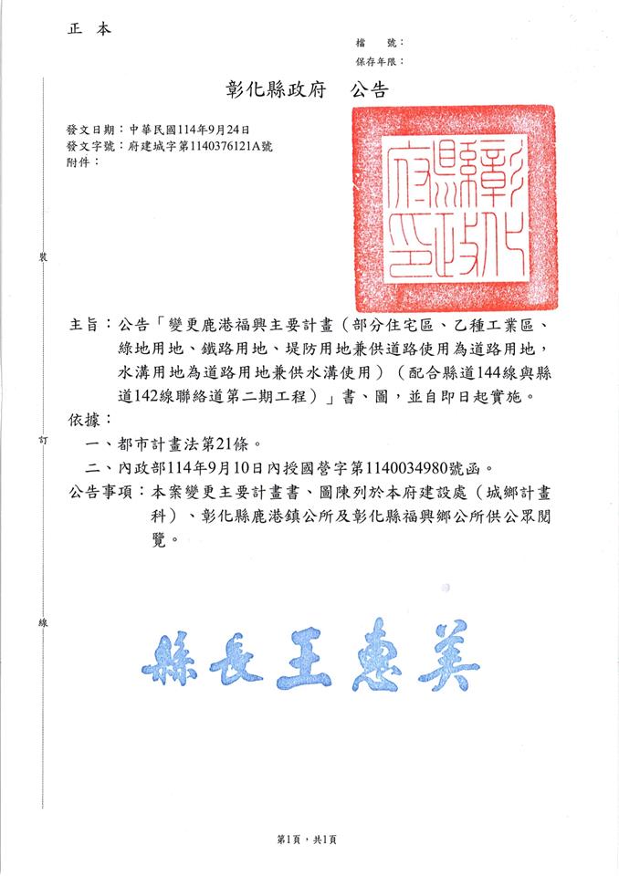 最新公告 公告公開展覽「變更鹿港福興主要計畫(部分住宅區、乙種工業區、綠地用地、鐵路用地、水溝用地、堤防用地兼供道路使用為道路用地)(配合縣道144線與縣道142線聯絡道第二期工程)案」計畫書、圖,並至即日起實施 發布日期: 2025/10/03~2025/11/29 | 瀏覽人數: 23人