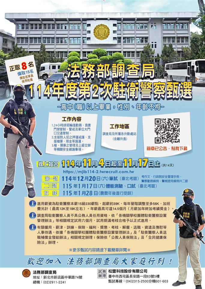 法務部調查局114年度第2次駐衛警察甄選