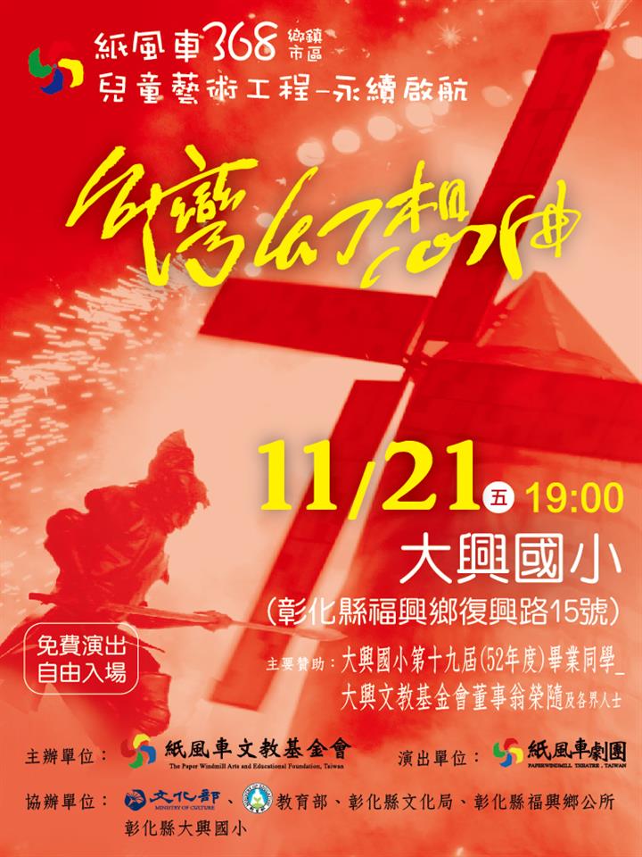其他資訊 紙風車文教基金會將於 114 年 11 月 21 日(五)晚上 7 點在大興國小操場 舉辦「紙風車368鄉鎮市區兒童藝術工程-永續啟航」 兒童戲劇演出! 發布日期: 2025/11/17~2025/12/17 | 瀏覽人數: 32人