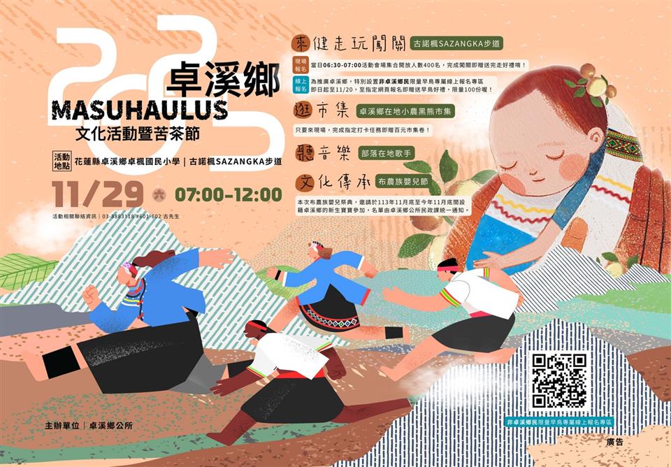 其他資訊 「114年度卓溪鄉Masuhaulus文化活動暨苦茶節x部落健走在地農夫黑熊市集」 發布日期: 2025/11/18~2025/11/29 | 瀏覽人數: 8人 活動相關資訊如下:一、日期:114年11月29日(星期六)上午7時至12時。二、地點:花蓮縣卓溪鄉卓楓國民小學。三、報名連結:https://forms.gle/vdT8dNoRVtsDyRco7。四、活動詳情:請至卓溪鄉公所2.0臉書粉絲專業https://www.facebook.com/profile.php?id=61574870410978&locale=zh_TW。五、活動聯絡人:古嘉偉先生,電話:03- 8883118分機602。