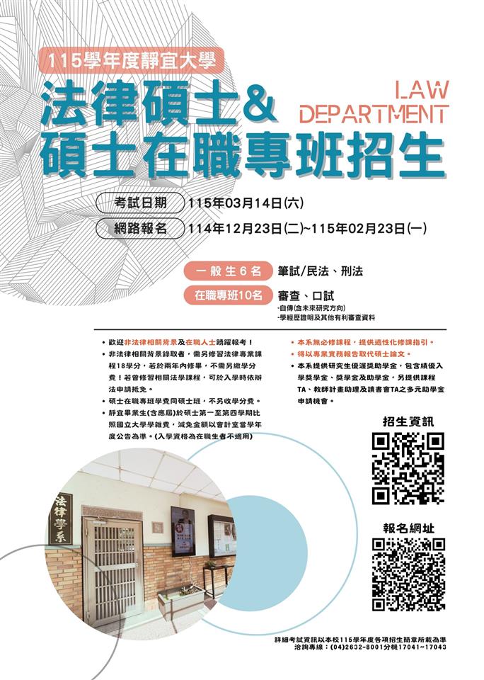 其他資訊 靜宜大學法律學系115學年度碩士班暨碩士在職專班招生 發布日期: 2025/12/30~2026/02/23 | 瀏覽人數: 15人 一、本校法律學系115學年度招生名額: (一)碩士班一般生:6名(非法律系畢業者亦得報考)。(二)碩士在職專班:10名(非法律系畢業者亦得報考)。二、招生相關資訊: (一)網路報名:即日起至115年2月23日止。(二)筆試暨口試日期:115年3月14日。(三)招生簡章及相關訊息連結:https://reurl.cc/EXlmVn。