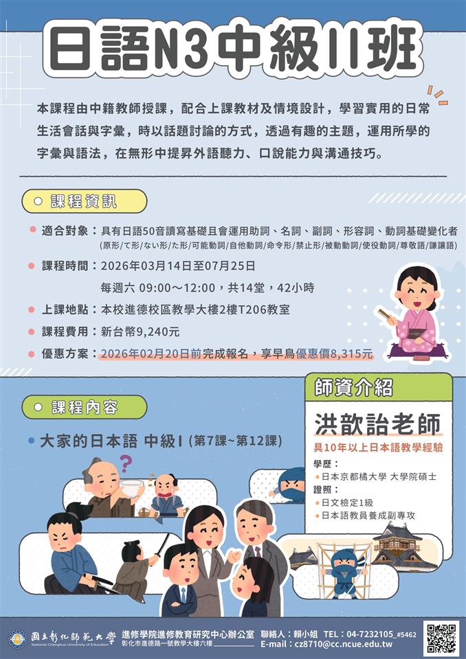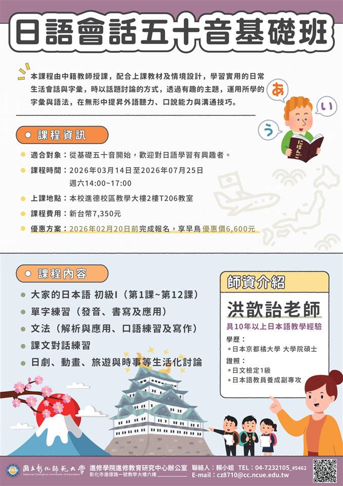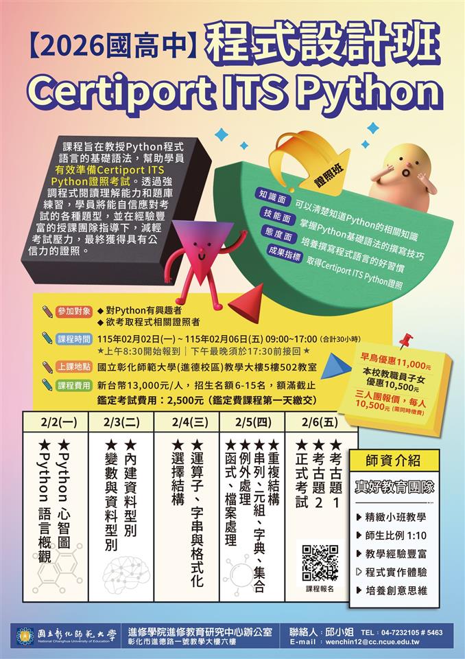 其他資訊 國立彰化師範大學進修學院推廣教育「【2026國高中程式語言】Certiport ITS Python程式設計班」、「日語會話五十音基礎班」、「日語N3中級Ⅱ班」課程 發布日期: 2026/01/21~2026/02/21 | 瀏覽人數: 8人 一、「【2026國高中程式語言】Certiport ITS Python程式設計班」(一)課程特色:Python是許多人學習文字型程式的第一選擇,它很貼近自然語言(英文),沒有複雜的符號。本課程將著重python程式語言的基礎語法,並協助考取Certiport ITS Python 證照。(二)課程時間:115年2月2日(一) 至2月6日(五) 9:00~17:00,合計30小時。(三)課程費用:13,000元/人。早鳥享優惠11,000元;三人團報價,每人10,500元(需同時缴費)。二、「日語會話五十音基礎班」(一)課程特色:本課程從基礎五十音開始教學,適合初學者。由中籍教師授課,搭配教材及情境設計,學習實用的生活會話與字彙,逐步提升學員聽力、口說與溝通技巧。(二)課程時間:115年3月14日至7月25日,週六14:00~17:00,共14堂,42小時。(三)課程費用:7,350元。2月20日前完成報名,享早鳥優惠價每人6,600元;舊生可於第六堂開始上課,享舊生優惠價4,015元。三、「日語N3中級Ⅱ班」(一)課程特色:由中籍教師授課,搭配教材及情境設計,學習實用的日常生活會話與字彙,時以話題討論的方式,透過有趣的主題,運用所學的字彙與語法,提升聽力、口說能力與溝通技巧。(二)課程時間:115年3月14日至7月25日(週六)9:00~12:00,共14堂,42小時 。(三)課程費用:9,240元。2月20日前完成報名,享早鳥優惠價每人8,315元。四、報名步驟:線上報名,請至本校進修學院報名管理系統報 名 。如第一次報名,請先申請帳號。(https://aps.ncue.edu.tw/cee/index.php)五、如有問題,請向進修學院進修教育研究中心洽詢 :(一)【程式設計班】邱 小 姐:04-7232105 分 機 5463 , E-mail :wenchin12@cc.ncue.edu.tw。(二)【日語班】賴小姐:(04)723-2105分機5462,E-mail:cz8710@cc.ncue.edu.tw。