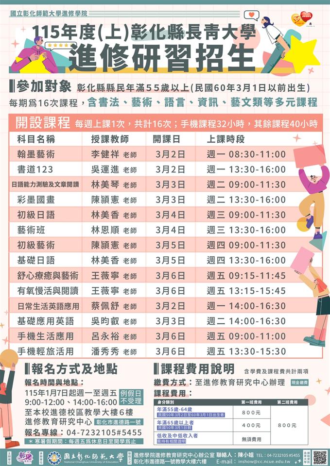其他資訊 國立彰化師範大學進修學院辦理「115上半年度彰化縣長青大學」招生 發布日期: 2026/01/21~2026/02/21 | 瀏覽人數: 7人 一、課程目的:結合地方政府與學校,建立終身學習楷模。二、指導單位:彰化縣政府(社會處)。三、上課日期:115年3月2日起,共計16週。四、上課地點:國立彰化師範大學進德校區(彰化縣彰化市進德路一號)。五、報名資格:凡設籍彰化縣且年滿55歲以上(民國60年3月1日以前出生)之彰化縣縣民。六、開設班別等課程相關資訊詳見招生簡章。七、報名洽詢專線:04-7232105分機5455 陳小姐-進修學院進修教育研究中心。