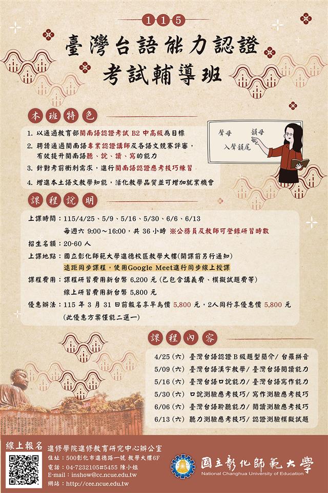 其他資訊 國立彰化師範大學進修學院推廣教育課程「115年臺灣台語認證基礎班-台羅拼音」、「115年臺灣台語能力認證考試輔導班」課程 發布日期: 2026/01/29~2026/02/28 | 瀏覽人數: 12人 一、「115年臺灣台語認證基礎班-台羅拼音」(一)課程特色:用18小時學習臺灣台語-台羅拼音!由通過臺灣台語認證專業講師授課,系統性介紹臺灣台語的基本音韻系統,包括聲母、韻母、聲調與連讀音變,透過拼音和實作練習達到雙倍學習效果。(二)課程時間:115年3月28日~115年4月18日,週六9:00~16:00,共計18時,公務人員及教師可登錄研習時數。(三)課程費用:1、實體課程:3,100 元。2、線上課程:2,800 元。3、3/5前報名享早鳥價 2,800 元,兩人以上同行每人享優惠2,800 元,此優惠方案僅能二選一。二、「115年臺灣台語能力認證考試輔導班」(一)課程特色:本班以通過教育部臺灣台語認證考試B2中高級為目標,聘請通過臺灣台語認證專業講師及各語文競賽評審,有效提升臺灣台語聽、說、讀、寫的能力。(二)課程時間:115年4月25日~115年6月13日,週六 9:00~16:00,共計36時,公務人員及教師可登錄研習時數。(三)課程費用:1、實體課程:6,200元。2、線上課程:5,800元。3、3/31前報名享早鳥價5,800元,兩人以上同行每人享優惠5,800元,此優惠方案僅能二選一。三、報名步驟:線上報名,請至本校進修學院報名管理系統報 名。如第一次報名, 請先申請帳號。(https://aps.ncue.edu.tw/cee/index.php)四、請詳閱課程招生簡章,如有問題,請向本校進修學院進修教育研究中心洽詢:(04)723-2105分機5455陳小姐,Email:inshow@cc.ncue.edu.tw。