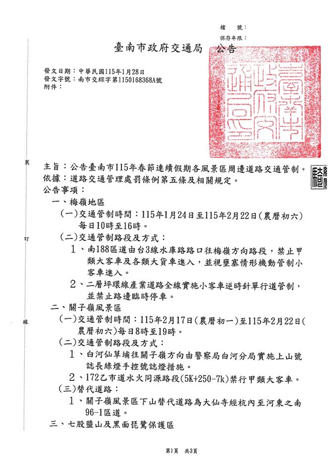 臺南市政府交通局檢送臺南市115年春節連續假期各風景區聯外道路交通管制公告