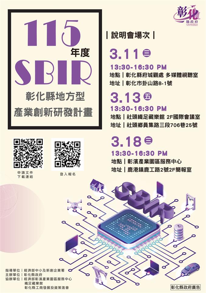 其他資訊 115年度「彰化縣地方產業創新研發推動計畫(地方型SBIR)」 發布日期: 2026/02/03~2026/03/18 | 瀏覽人數: 68人 一、為提升中小企業研發技術能量,本府今年賡續辦理115年彰化縣地方產業創新研發推動計畫(地方型SBIR),不限產業別歡迎縣內中小企業提出申請。二、協助縣內中小企業了解計畫相關內容,分別於3月11日、3月13日及3月18日假本府城觀處多媒體視聽室、社頭織足藏樂館2樓國際會議室及彰濱產業園區服務中心辦理3場次說明會,報名網址:https://reurl.cc/VmbM0R。