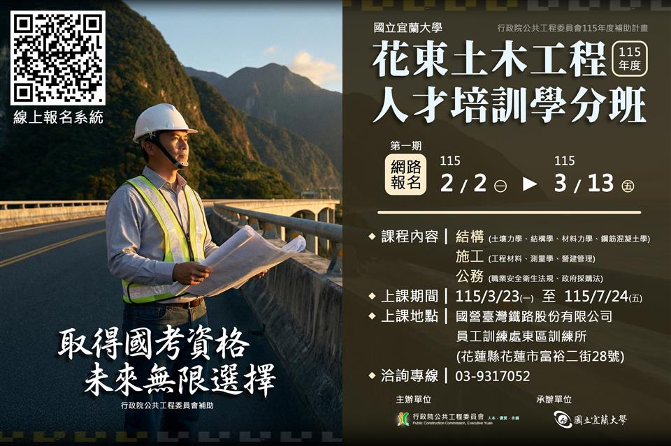 其他資訊 「 花東土木工程人才培訓學分班」招生資訊 發布日期: 2026/02/03~2026/07/17 | 瀏覽人數: 22人 一、學分班開設二期各三大領域課程:(一)課程:1、結構領域(4門課):土壤力學(3學分)、材料力學(3學分)、結構學(3學分)、鋼筋混凝土學(3學分)。2、施工領域(3門課):測量學(3學分)、營建管理(3學分)、工程材料(2學分)。3、公務領域(2門課):政府採購法(3學分)、職業安全衛生法規(3學分)。(二)對象:1、欲參加土木工程相關國家考試之社會大眾。2、本科生及跨領域轉職者。3、政府機關及民營企業之採購、職安需求人員。(三)特色:1、協助學員取得國家考試應考資格及加強複習考試科目。2、協助學員學習公務領域專業技能及考取專業證照。3、獎勵機制:「結構領域」與「施工領域」課程,凡取得選修科目學分,且滿足國考應試資格者,即退還該選修課程科目50%學分費。二、招生日程與方式:(一)報名日期:1、第一期課程: 115 年 2 月 2 日至 3 月 13 日止。2、第二期課程: 115 年 5 月 25 日至 7 月 17 日止。(二)報名方式: 一律採網路報名,網址為:https://ccsys.niu.edu.tw/Exam/LSMTOLL/。三、上課地點:國營臺灣鐵路股份有限公司員工訓練處東區訓練所(花蓮縣花蓮市富裕二街 28 號,近花蓮火車站)。四、相關報名問題請洽本校教務處進修推廣組林小姐,電話:(03) 931-7052 。