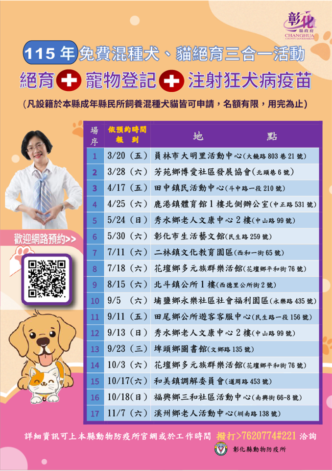 其他資訊 「115年度免費犬貓絕育三合一工作」活動 發布日期: 2026/03/09~2026/11/07 | 瀏覽人數: 14人 本縣115年度免費犬貓絕育三合一工作期程如下:(一)3/20 (五)員林市大明里活動中心(大饒路803巷21號)(二)3/28 (六)芳苑鄉博愛社區發展協會(北頭巷6號)(三)4/17 (五)田中鎮民活動中心(斗中路一段210號)(四)4/25 (六)鹿港鎮體育館1樓北側辦公室(中正路531號)(五)5/24 (日)秀水鄉老人文康中心2樓(中山路99號)(六)5/30 (六)彰化市生活藝文館(民生路259號)(七)7/11 (六)二林鎮文化教育園區(西和一街65號)(八)7/18 (六)花壇鄉多元族群樂活館(花壇鄉平和街76號)(九)8/15 (六)北斗鎮公所1樓(西德里公所街2號)(十)9/5 (六)埔鹽鄉永樂社區社會福利園區(永樂路435號)(十一)9/11 (五)田尾鄉公所遊客客服中心(民生路一段156號)(十二)9/13 (日)秀水鄉老人文康中心2樓(中山路99號)(十三)9/23 (三)埤頭鄉圖書館(文鄉路135號)(十四)10/3 (六)花壇鄉多元族群樂活館(花壇鄉平和街76號)(十五)10/17(六)和美鎮調解委員會(道周路453號)(十六)10/18(日)福興鄉三和社區活動中心(南興街66-8號)(十七)11/7 (六)溪州鄉老人活動中心(圳南路138號)