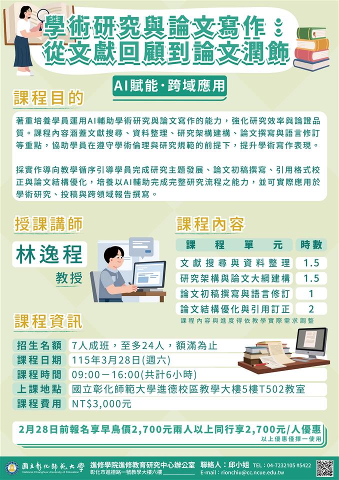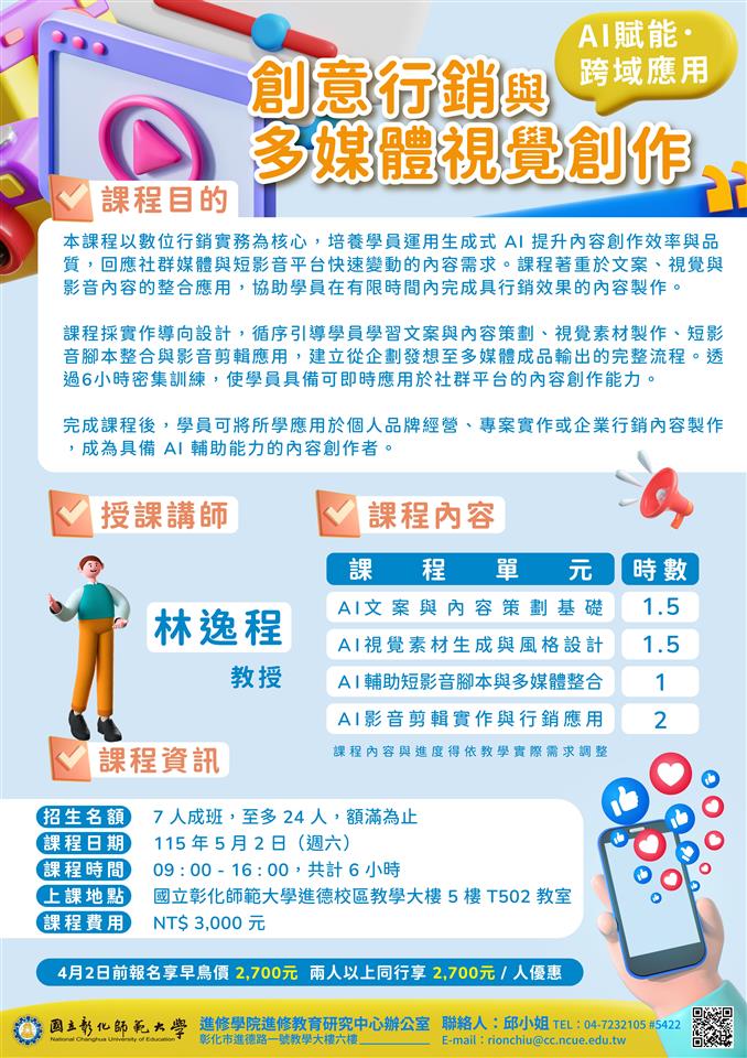 其他資訊 國立彰化師範大學進修學院推廣教育課程「AI賦能-跨域應用:學術研究與論文寫作:從文獻回顧到論文潤飾」、「【AI賦能.跨域應用】創意行銷與多媒體視覺創作」課程 發布日期: 2026/03/09~2026/04/09 | 瀏覽人數: 11人 一、「AI賦能-跨域應用:學術研究與論文寫作:從文獻回顧到論文潤飾」(一)課程特色:本課程採實作導向,循序教導學員利用 AI 進行文獻搜尋、研究構思與初稿撰寫。重點涵蓋語言潤飾、格式校正及論證結構優化,協助學員成為兼具學術論理與 AI 技能的高效學術寫作人才。(二)課程時間:115年3月28日 (週六) 09:00-16:00,共計6小時。(三)課程費用:3,000元,開課前1個月報名享早鳥價2,700元;兩人以上同行每人享2,700元優惠。以上優惠擇一使用,不可併用。二、「【AI賦能.跨域應用】創意行銷與多媒體視覺創作」(一)課程特色:本課程採實作導向,透過 AI 文案策劃、視覺生成、短影音腳本編排及自動化剪輯四階段,在 6 小時內強化學員的數位行銷實務能力,成為能即時產出社群內容的全能創作者。(二)課程時間:115年5月2日 (週六)09:00-16:00,共計6小時。(三)課程費用:3,000元,開課前1個月報名享早鳥價2,700元;兩人以上同行每人享2,700元優惠。以上優惠擇一使用,不可併用。三、報名步驟:線上報名,請至本校進修學院報名管理系統報 名。如第一次報名, 請先申請帳號。(https://aps.ncue.edu.tw/cee/index.php)四、請詳閱課程招生簡章,如有問題,請向本校進修學院進修教育研究中心洽詢:(04)723-2105分機5422邱小姐,Email:rionchiu@cc.ncue.edu.tw。