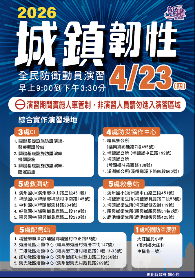 最新公告 「2026城鎮韌性(全民防衛動員)演習」 發布日期: 2026/04/21~2026/05/22 | 瀏覽人數: 51人 彰化縣政府府謹訂於本(115)年4月22、23日(星期三、四)辦理2026城鎮韌性(全民防衛動員)演習。