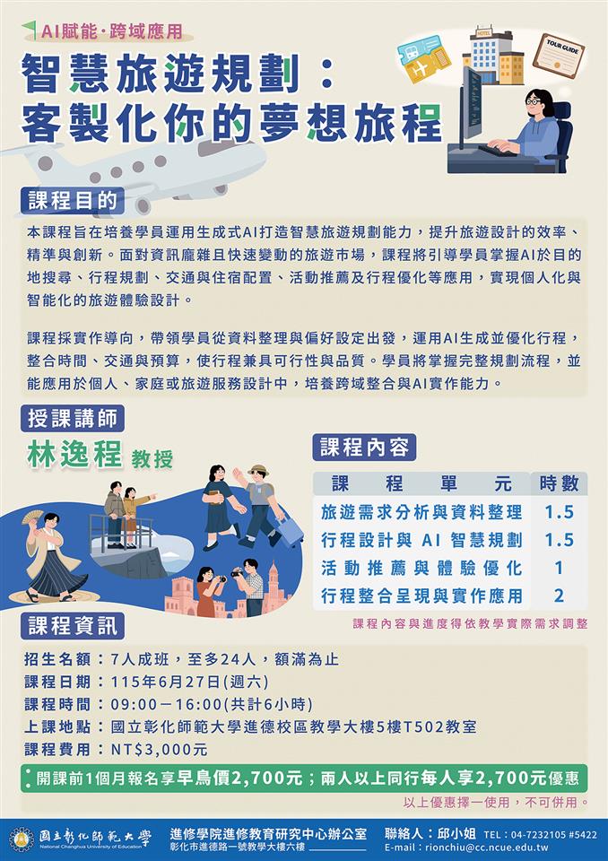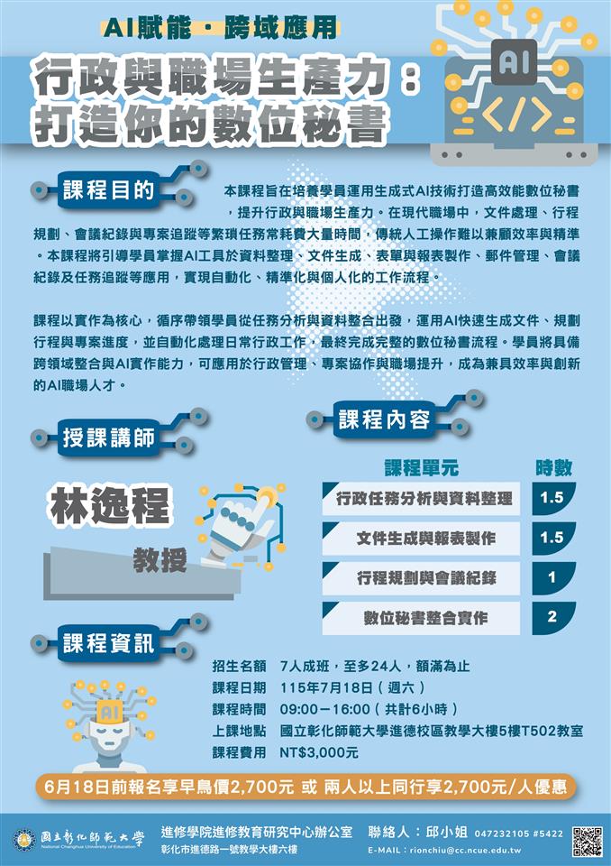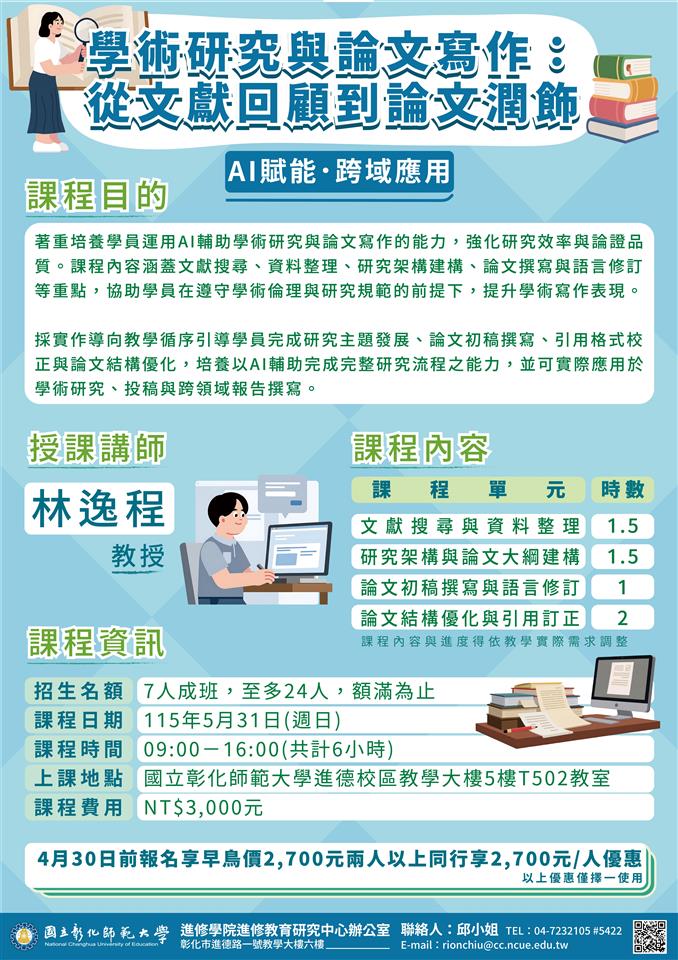 其他資訊 國立彰化師範大學進修學院推廣教育課程「【AI賦能.跨域應用】 學術研究與論文寫作:從文獻回顧到論文潤飾」、「【AI賦能.跨域應用】 智慧旅遊規劃:客製化你的夢想旅程」、「【AI賦能.跨域應用】 行政與職場生產力:打造你的數位秘書」課程 發布日期: 2026/04/21~2026/05/21 | 瀏覽人數: 7人 一、「【AI賦能.跨域應用】 學術研究與論文寫作:從文獻回顧到論文潤飾」(一)課程特色:課程採實作導向,教導學員利用 AI 進行文獻搜尋、研究構思與初稿撰寫。重點涵蓋語言潤飾、格式校正及論證結構優化,協助學員成為兼具學術論理與 AI 技能的高效學術寫作人才。(二)課程時間:115年5月31日(週日) 09:00-16:00,共計6小時。(三)課程費用:3,000元,開課前1個月報名享早鳥價2,700元;兩人以上同行每人享2,700元優惠。以上優惠擇一使用,不可併用。【AI賦能.跨域應用】學術研究與論文寫作舊生另享優惠2,500元。 二、「【AI賦能.跨域應用】 智慧旅遊規劃:客製化你的夢想旅程」(一)課程特色:課程採實作導向,運用AI生成並優化個人化旅遊行程,整合時間、交通、預算,培養完整規劃能力,並應用於個人或企業專案。(二)課程時間:115年6月27日(週六) 09:00-16:00,共計6小時。(三)課程費用:3,000元,開課前1個月報名享早鳥價2,700元;兩人以上同行每人享2,700元優惠。以上優惠擇一使用,不可併用。三、「【AI賦能.跨域應用】 行政與職場生產力:打造你的數位秘書」(一)課程特色:課程以實作為核心,教導運用AI自動化處理行政、行程與專案管理。學員將掌握數位秘書工作流,提升跨域整合力與職場效率,成為精準創新的AI實務專才。(二)課程時間:115年7月18日(週六) 09:00-16:00,共計6小時。(三)課程費用:3,000元,開課前1個月報名享早鳥價2,700元;兩人以上同行每人享2,700元優惠。以上優惠擇一使用,不可併用。四、報名步驟:線上報名,請至本校進修學院報名管理系統報 名。如第一次報名, 請先申請帳號。(https://aps.ncue.edu.tw/cee/index.php)五、請詳閱課程招生簡章,如有問題,請向本校進修學院進修教育研究中心洽詢:(04)723-2105分機5422邱小姐,Email:rionchiu@cc.ncue.edu.tw。