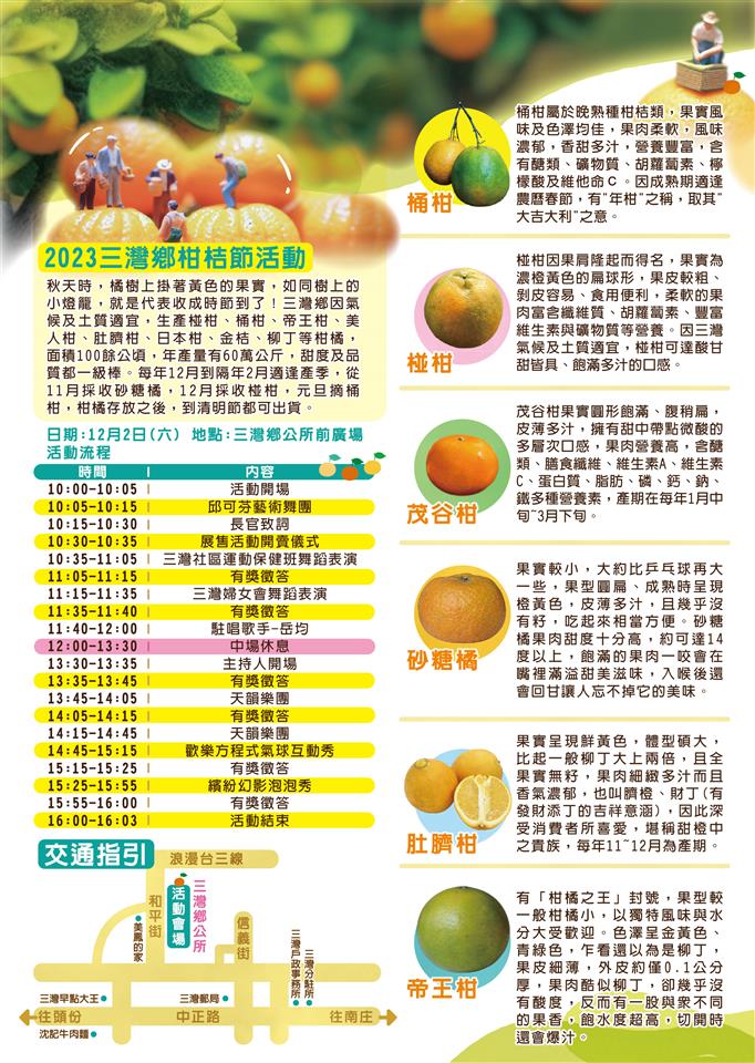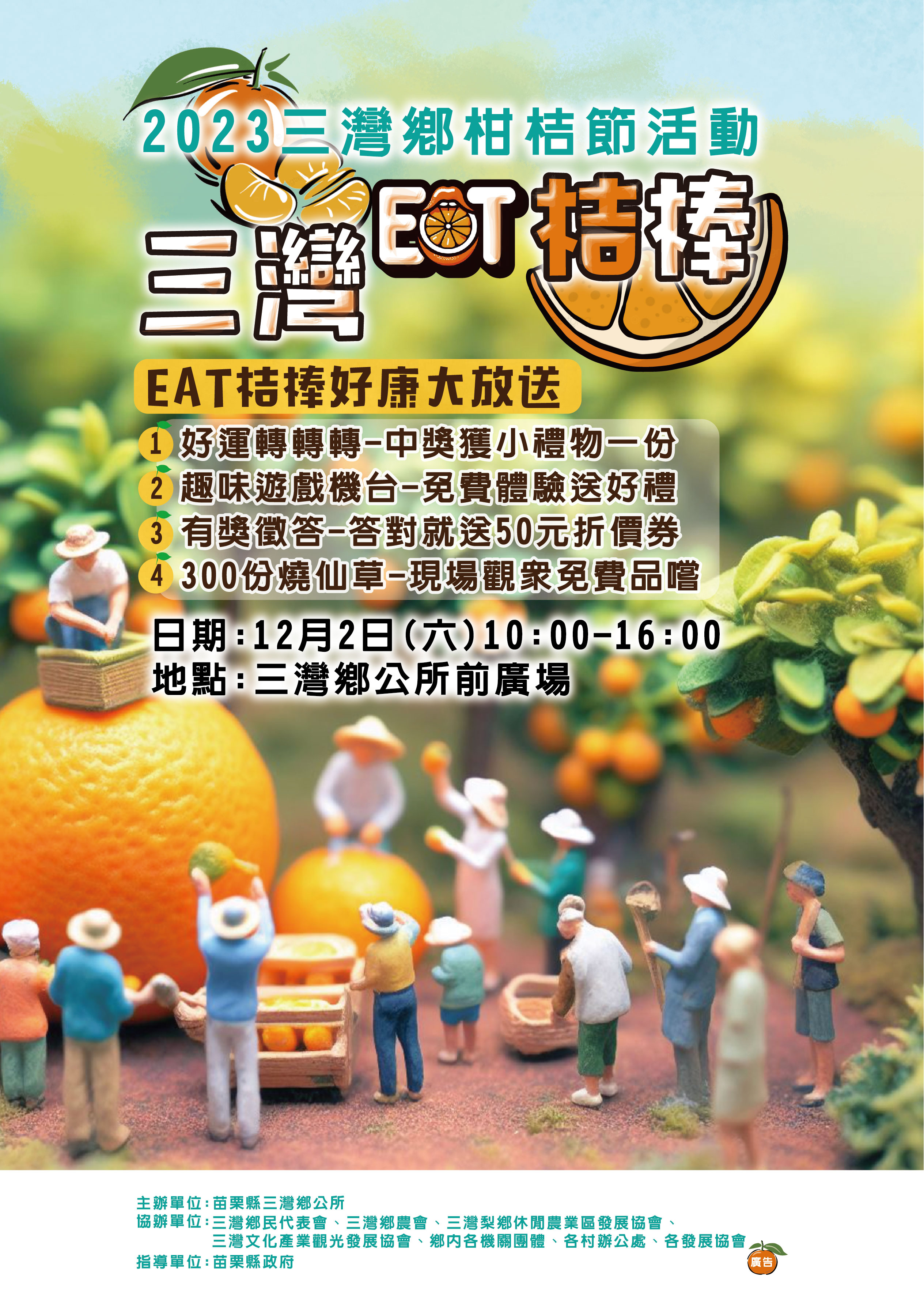 其他資訊 苗栗縣三灣鄉公所辦理「2023年三灣鄉柑桔節」活動,訂於112年12月2日(星期六)上午10時至下午4時假三灣鄉公所前廣場舉行,歡迎鄉親共襄盛舉。 歷史訊息 | 發布日期: 2023/12/01~2024/01/01 | 瀏覽人數: 52人