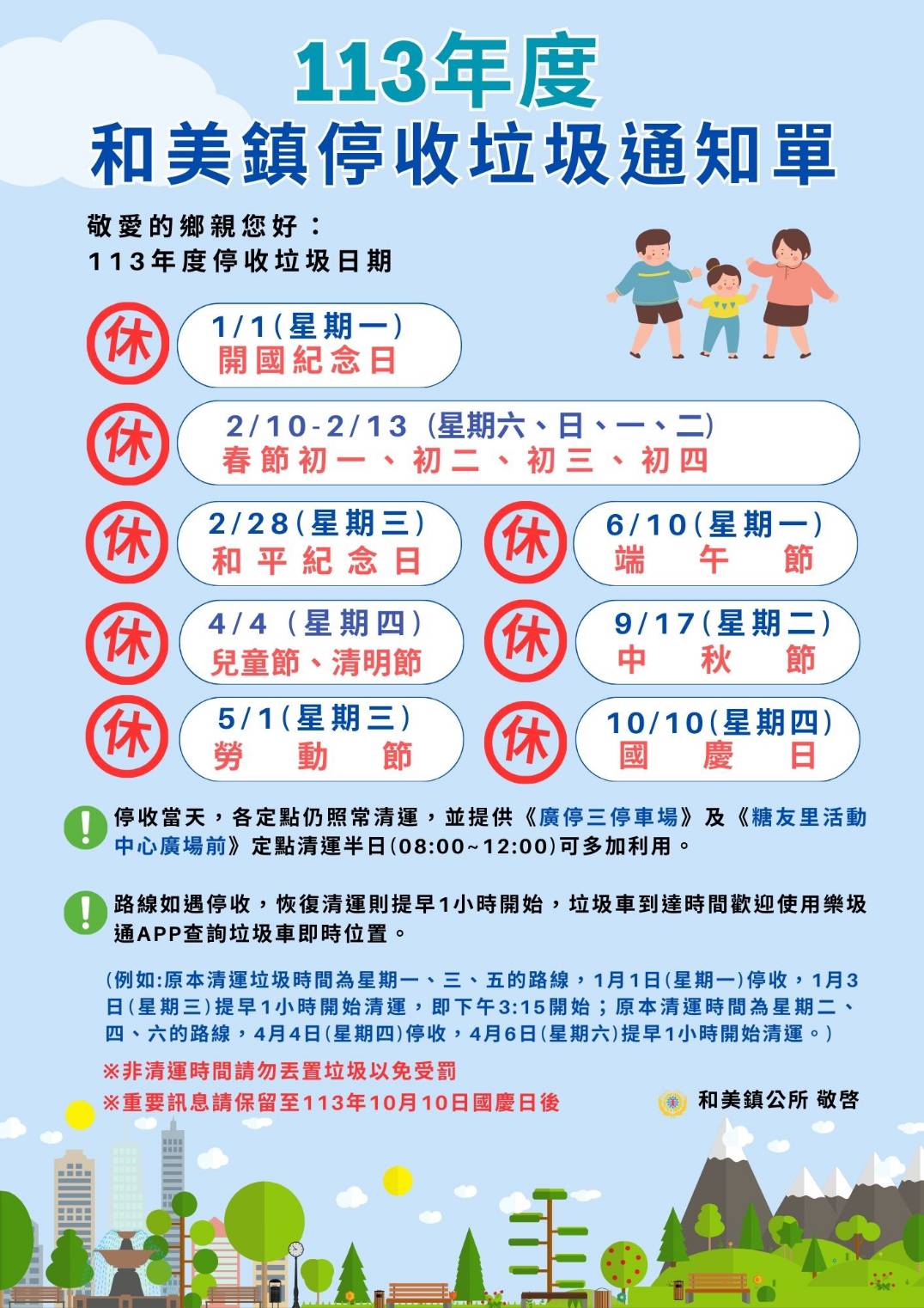 最新公告 113年度和美鎮停收垃圾日期通知單 歷史訊息 | 發布日期: 2023/12/12~2024/10/10 | 瀏覽人數: 298人 敬愛的鄉親您好: 本鎮113年停收垃圾日期,設有定點清運服務~以下是定點清運服務的時間與地點,請大家注意哦!😊#保護環境你我有責#定點清運服務 #非清運時間請勿丟置垃圾以免受罰