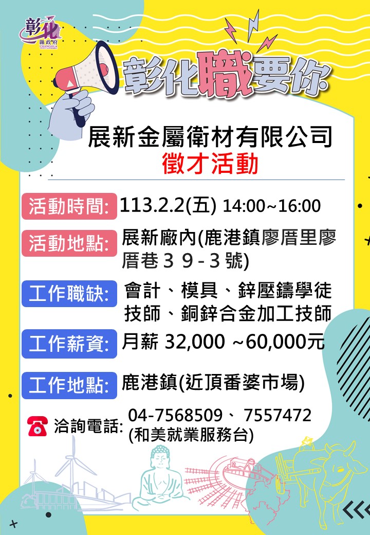 徵才資訊 展新單一徵才活動 歷史訊息 | 發布日期: 2024/01/31~2024/02/02 | 瀏覽人數: 34人 | 聯絡資訊: 和美就服台 04-7568509、7557472 性 質:單一徵才活動 廠商名稱:展新金屬衛材有限公司活動時間:113年2月2日(五)下午2:00-4:30活動地點:展新廠內(鹿港鎮廖厝里廖厝巷39-3號) ◎活動職缺:會計、鋅壓鑄學徒/技師、模具技師、銅合金加工技師、水龍頭開發設計工程師等工作地點:鹿港鎮(近頂番婆市場)◎工作時間:依公司規定 ◎公司簡介:客製鋅合金壓鑄五金件 ,主要產品汽機車零件、衛浴配件、門把門鎖零件等。公司網址https://www.jaanshin-msm.com/◎福利制度: 除按勞基法之福利及制度,周休二日制外,另有:1.三節獎金2.免費午餐 3.尾牙…等
