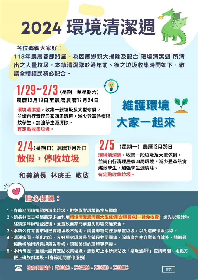 最新公告 環境清潔週於2/5(一)結束 歷史訊息 | 發布日期: 2024/02/02~2024/02/29 | 瀏覽人數: 36人 | 聯絡資訊: 蔣技士 04-7358519 🔔溫馨小提醒🔔各位鄉親朋友大家好~阿壬提醒大家,本鎮清潔隊環境清潔週將於2/5(一)結束免費清運大型傢俱囉!請各位鄉親特別注意清運時間,環清週結束後,清潔隊將停止免費清運,且2/6(二)起登記之清運單將於過年後方可開始清運,再煩請鄉親多多留意~感謝您的配合🙏和美鎮長林庚壬 提醒您