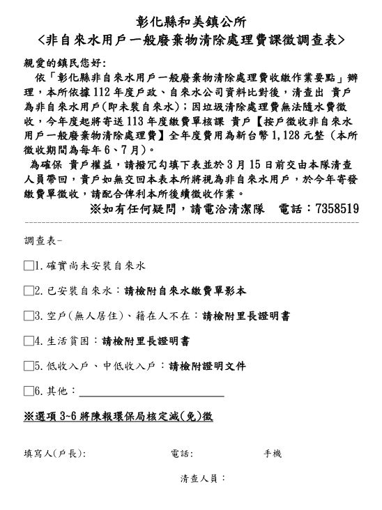 最新公告 非自來水用戶一般廢棄物清除處理費課徵調查表 歷史訊息 | 發布日期: 2024/02/29~2024/03/16 | 瀏覽人數: 33人 本鎮清潔隊於113.3.1~113.3.15執行非自來水用戶一般廢棄物清除處理費課徵調查工作