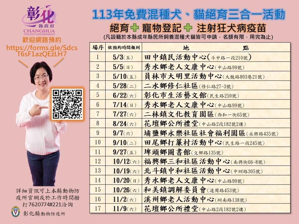 其他資訊 本縣「113年度免費犬貓絕育三合一工作」活動期程,本鎮排定於10/26(六)和美鎮調解委員會辦理。 歷史訊息 | 發布日期: 2024/03/07~2024/04/07 | 瀏覽人數: 24人 | 聯絡資訊: 林先生 分機225