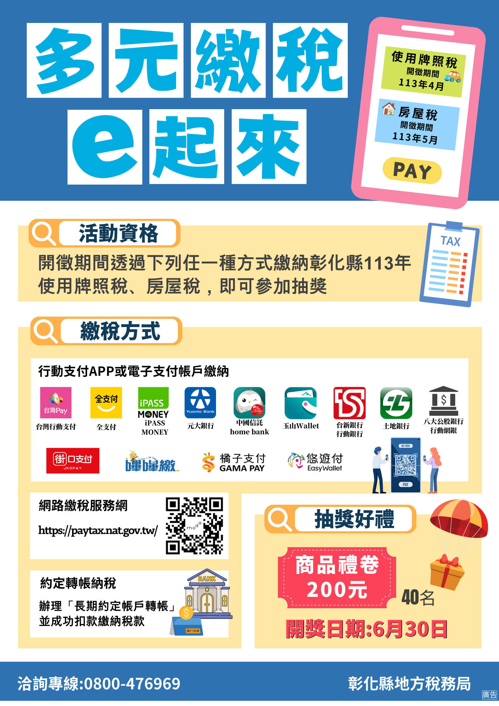 其他資訊 彰化縣地方稅務局舉辦113年度「多元繳稅e起來」宣導活動,請踴躍參加。 歷史訊息 | 發布日期: 2024/04/17~2024/05/17 | 瀏覽人數: 25人 | 聯絡資訊: 謝明芬 。