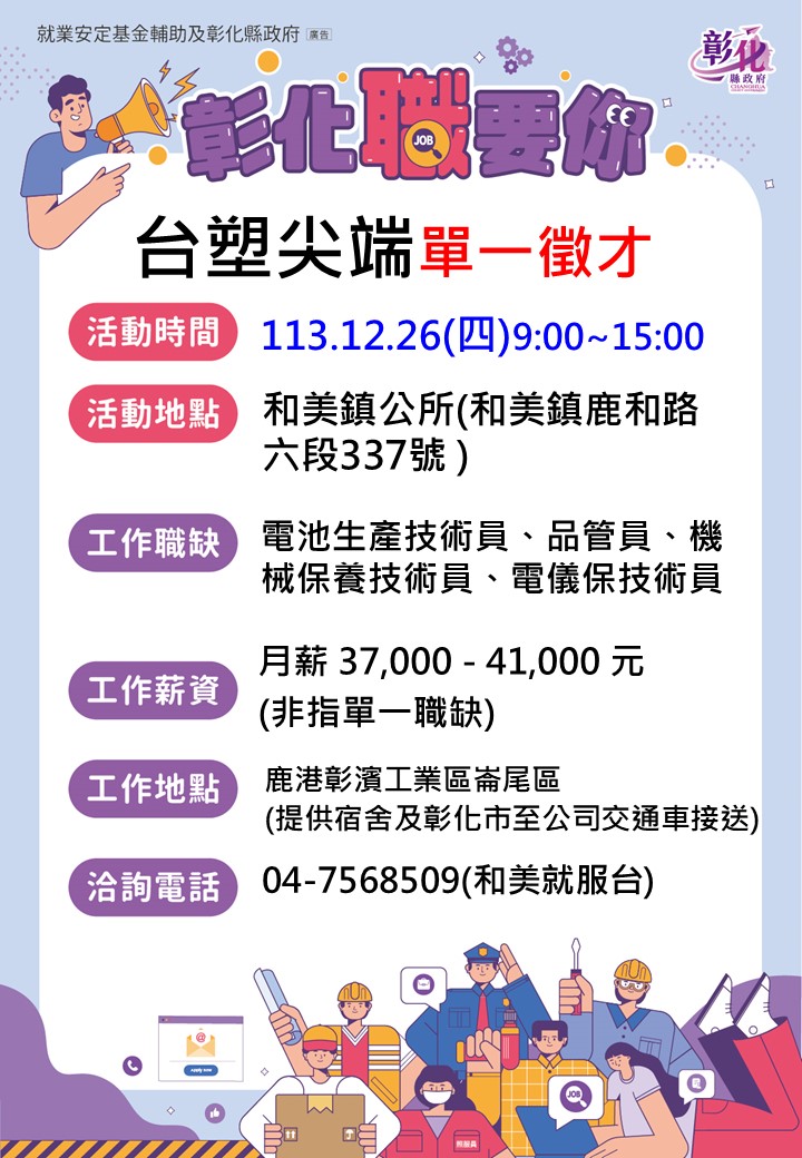 其他資訊 台塑尖端能源科技股份有限公司單一廠商徵才活動 歷史訊息 | 發布日期: 2024/12/23~2024/12/26 | 瀏覽人數: 146人 | 聯絡資訊: 和美就服台 04-7568509 活動時間:113年12月26日(星期三) 9:00 ~ 15:00 活動地點:和美鎮公所(和美鎮鹿和路六段337號) 職業名稱:電池生產技術員、品管員、機械保養技術員、電儀保技術員薪 資:37,000-41,000元 (非指單一職缺、輪班有輪班津貼)工作內容:電池製造業教育程度:高中以上 交通能力:1.能自行前往2.提供住宿 3.彰化市至公司交通車接送 工作地點:鹿港彰濱工業區崙尾區 工作時間:輪班 僱用期限:長期性公司簡介:台塑新智能2023年透過子公司「台灣尖端能源」在彰濱工業區投資上百億元,建造全台灣規模最大的5GWh鋰鐵電芯及模組廠,為電動車及儲能系統提供安全、穩定的鋰鐵電芯,打造完整的國產電池產業鏈,開啟台灣新能源產業的新紀元。福利制度: 年資每滿五年贈1枚24K紀念金幣、每年固定調薪制度、高於業界水準的年終及三節獎金、員工及眷屬至長庚醫院就醫補助、免費健檢、保健諮詢服務、電動機車換購補助1.6萬元、新購補助1萬元、生日禮物券、三節福利券、春秋兩季員工郊遊、踏青補助、歲末年終歡樂聚餐、0到6歲每月2千元育兒補助、懷孕福袋、寶寶禮品及禮金、子女教育獎學金