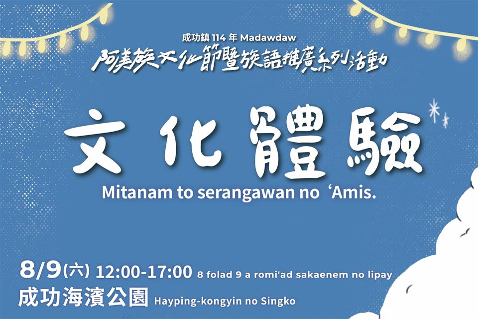 其他資訊 臺東縣成功鎮公所辦理「成功鎮114年度Madawdaw阿美族文化節暨族語推廣系列活動」 歷史訊息 | 發布日期: 2025/07/24~2025/08/09 | 瀏覽人數: 51人 一、活動資訊如下:(一) 活動日期:114年8月9日(六)(二) 活動時間:下午13:00至下午21:00(三) 活動地點:臺東縣成功海濱公園、成功鎮原住民文物館(四) 活動內容:1、阿美族傳統舞蹈競賽、阿美族傳統歌謠競賽。2、文化體驗營、部落市集、打卡抽獎趣。3、留言.穿說打開阿美族文化的更衣室策展活動。4、部落嗨一「夏」晚會&璀璨千發煙火秀。二、活動相關資訊請逕上臺東縣成功鎮公所FB粉絲專頁(https://www.facebook.com/chgcon)或活動粉絲專頁(https://www.facebook.com/profile.php?id=61561589739551)查詢。