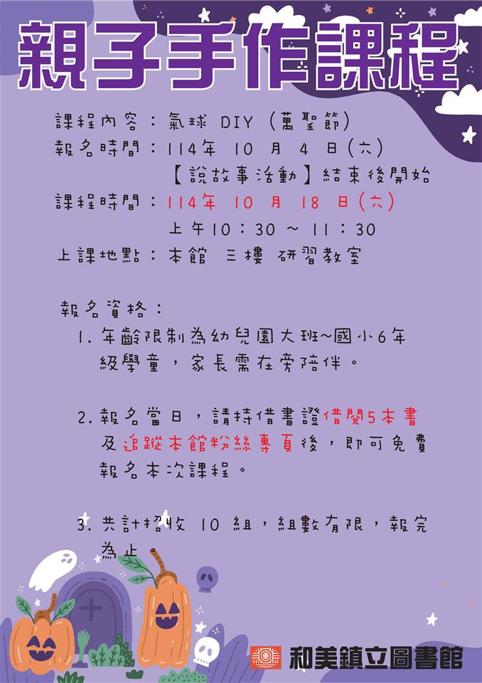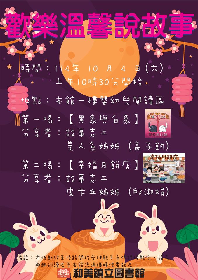 最新公告 和美鎮立圖書館-活動快訊 --【歡樂溫馨說故事】,活動結束後開始【親子手作課程】報名 發布日期: 2025/10/02~2025/10/04 | 瀏覽人數: 18人 | 聯絡資訊: 李彥宏 04-7560664分機15 【歡樂溫馨說故事】時間:114年10月4日 (六) 上午10:30 開始地點:本館 一樓 嬰幼兒閱讀區第一場:【黑象與白象】分享者:故事志工 美人魚姊姊 (高子鈞)第二場:【幸福月餅店】分享者:故事志工 皮卡丘姐姐 (邱淑娟)=== 活動後開始【親子手作課程】報名 ===歡迎大朋友、小朋友踴躍參加!