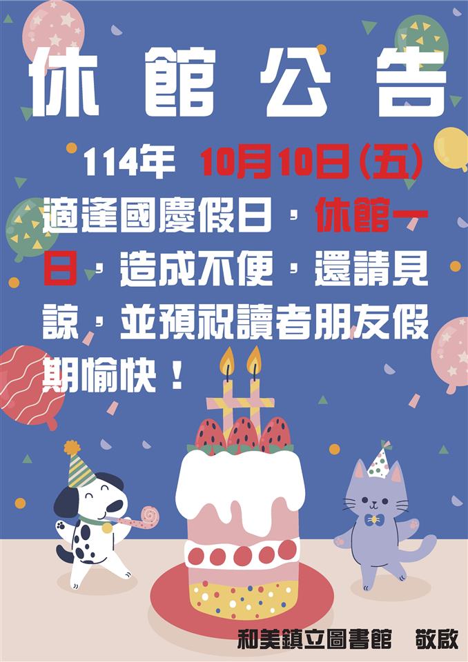 最新公告 和美鎮立圖書館-【國慶日休館公告】 發布日期: 2025/10/02~2025/10/10 | 瀏覽人數: 20人 | 聯絡資訊: 李彥宏 04-7560664分機15 114年10月10日國慶日休館一天和美鎮立圖書館 祝大家佳節愉快