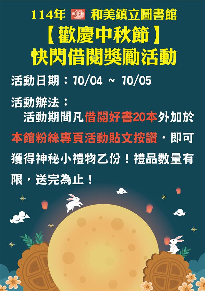 最新公告 和美鎮立圖書館-【歡慶中秋節】快閃借閱獎勵活動 發布日期: 2025/10/02~2025/10/05 | 瀏覽人數: 18人 | 聯絡資訊: 李彥宏 04-7560664分機15 活動日期:10/04 (六) ~ 10/05 (日)活動辦法:活動期間凡借閱 好書20本 外加於本館粉絲專頁活動貼文按讚,即可 獲得神秘小禮物乙份!禮品數量有限,贈完為止!