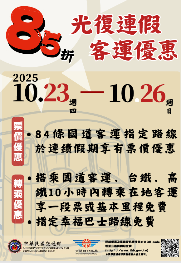 轉知~公路局114年光復節連續假期公共運輸優惠措施