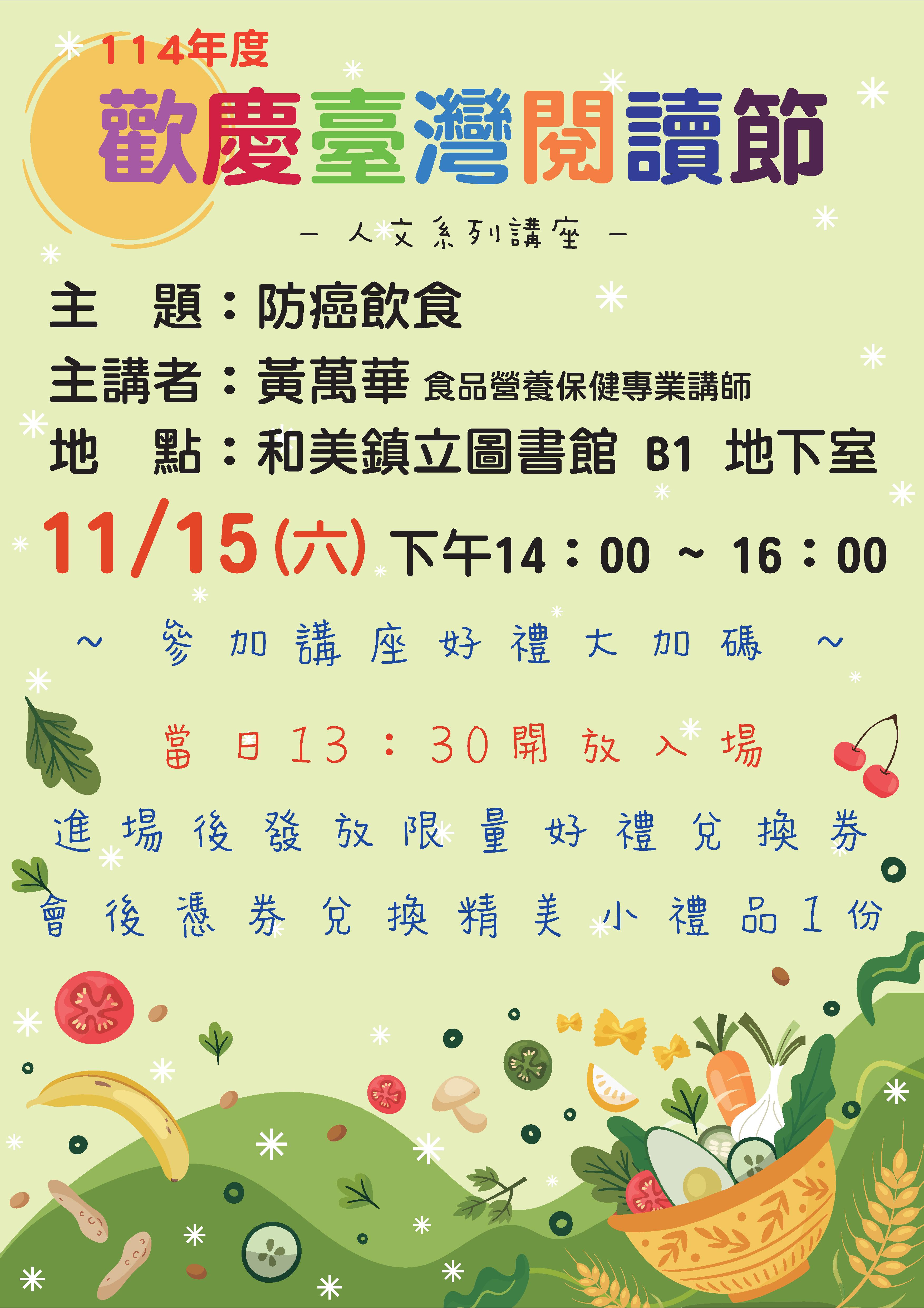 藝文資訊 和美鎮立圖書館-健康生活講座:防癌飲食 發布日期: 2025/11/11~2025/11/15 | 瀏覽人數: 25人 | 聯絡資訊: 李先生 04-7560664分機15 和美鎮立圖書館-健康生活講座:防癌飲食黃萬華 講師/食品營養保健專業講師時間:114年11月15日(六) 下午2:00~4:00地點:本館 地下一樓現代人要如何從日常飲食實踐健康呢!!?如何吃的健康,遠離加工食品、減少塑膠容器、選擇在地當季食材,一起來聽講座,吃得更安心喔#活動結束參加者加送精美小禮物#QA有獎問答#免報名自由入場#和美鎮立圖書館