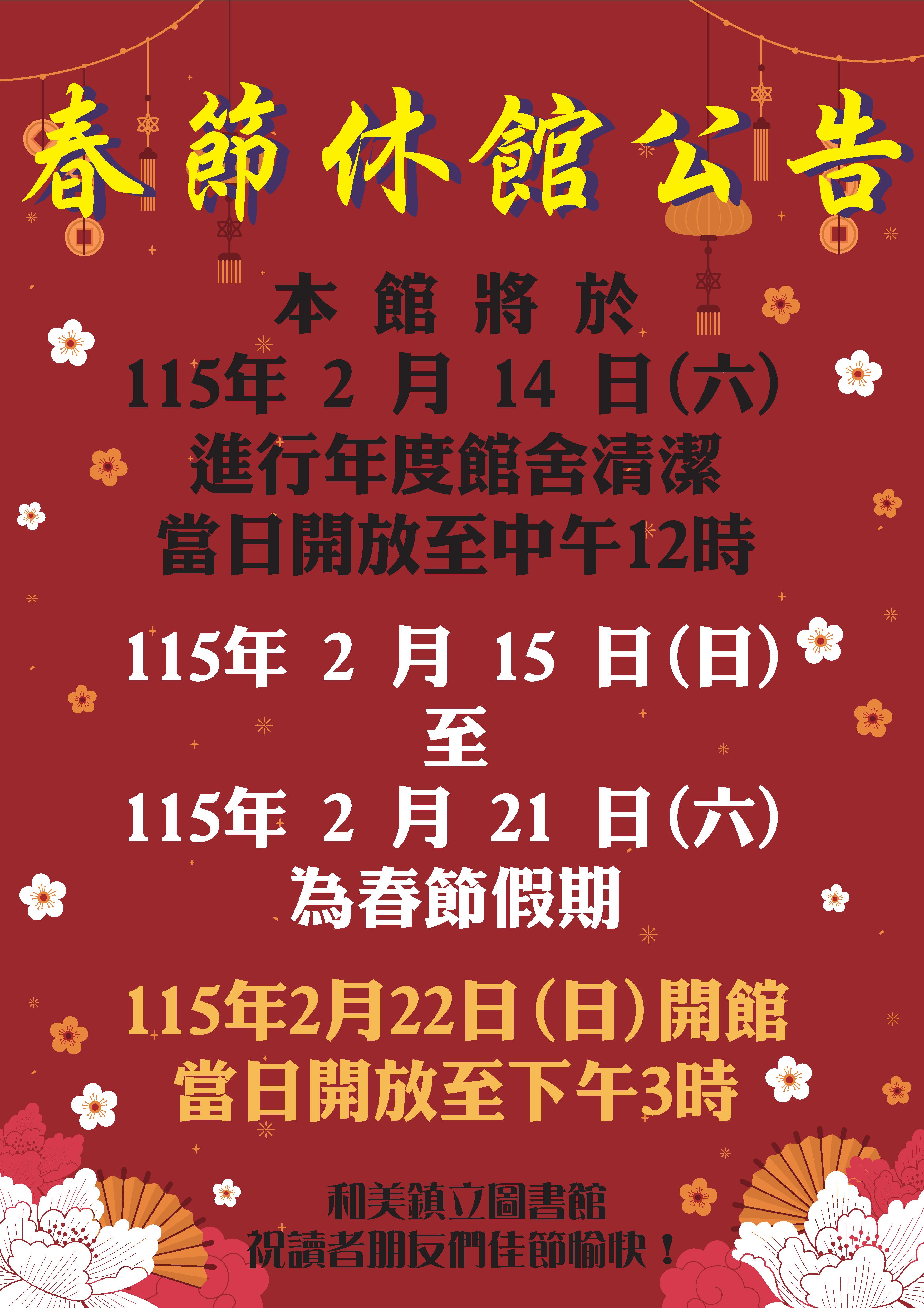 最新公告 和美鎮立圖書館115年【春節休館公告】 發布日期: 2026/02/06~2026/02/24 | 瀏覽人數: 20人 | 聯絡資訊: 04-7560664 【春節休館公告】先預祝大家新年快樂!本館春節期間開放時間如下: 2/14(六):進行年度館舍清潔,當日開放至中午12時 2/15(日)至 2/21(六):休館 2/22(日)開館當日開放至下午3時祝福大家新春愉快,闔家平安! #和美鎮立圖書館