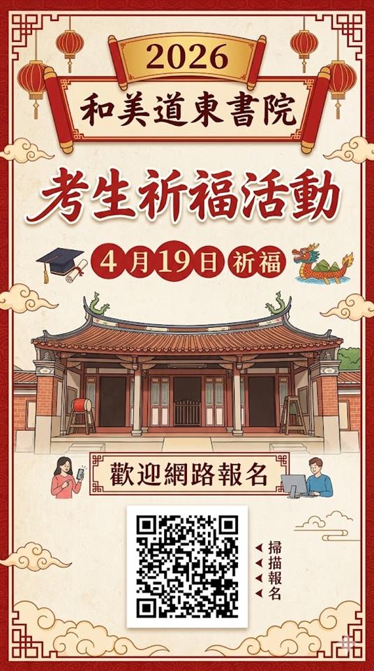藝文資訊 道東書院4月19日「考生祈福暨國樂詩歌演藝」活動 發布日期: 2026/04/02~2026/04/19 | 瀏覽人數: 47人 | 聯絡資訊: 謝小姐 047560620分機123 活動日期:115年4月19日活動時間:上午8:00-12:00活動地點:國定古蹟道東書院(和美鎮和卿路101號)考生祈福報名專線:0988-852566陳先生、0953-586033郭小姐考生祈福線上報名連結:https://forms.gle/PqAhxk8oSULVsHFq8