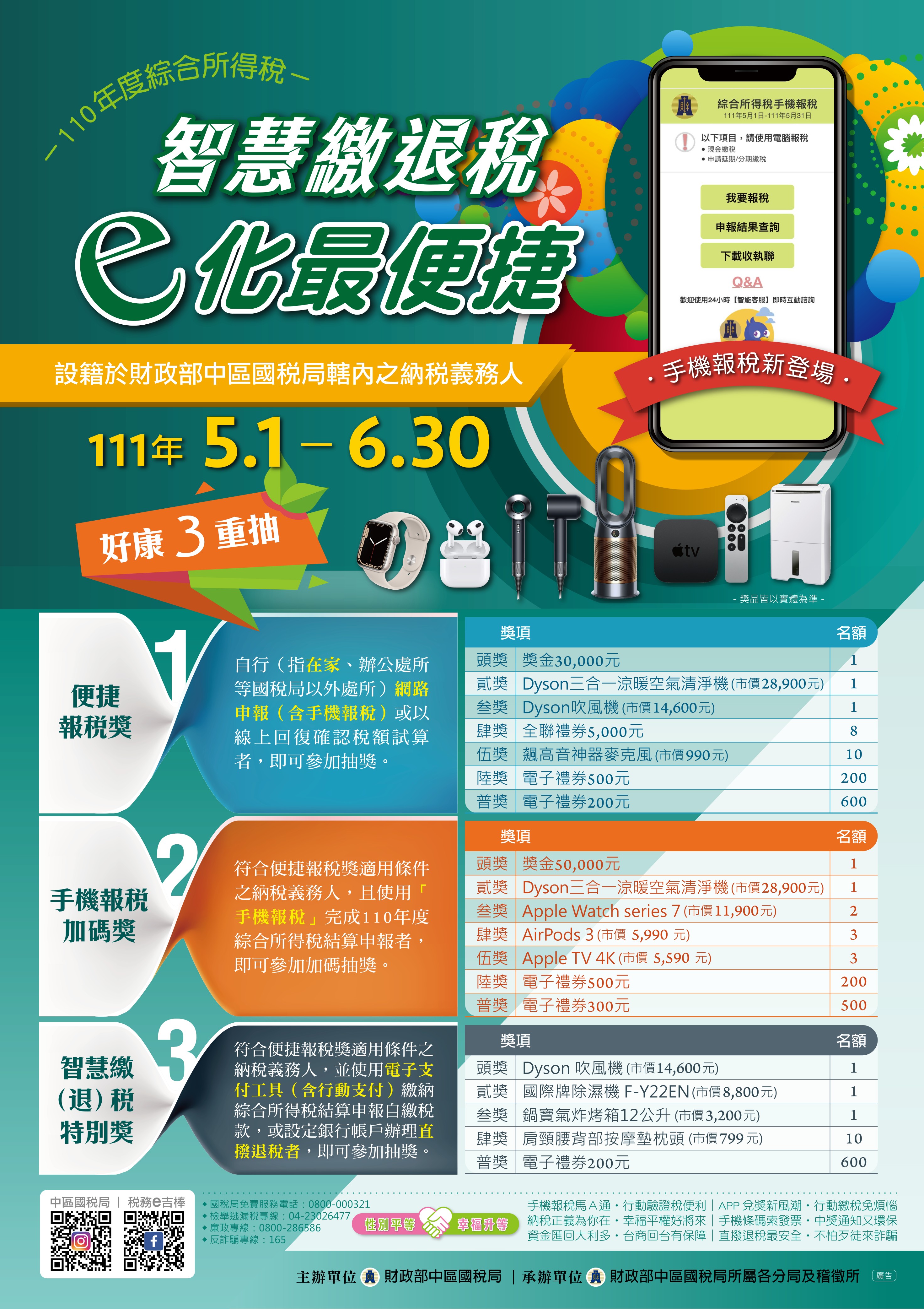 其他資訊 110年度綜合所得稅申報期間業經財政部公告展延為111年5月1日起至同年6月30日 歷史訊息 | 發布日期: 2022/05/11~2022/06/11 | 瀏覽人數: 59人 | 聯絡資訊: 唐梅齡 一、110年度綜合所得稅申報期間業經財政部公告展延為111年5月1日起至同年6月30日,相關綜合所得稅申報附件收件至111年7月11日。 二、為降低群聚傳染風險,請多加利用線上版網路申報系統、手機版申報系統或採線上回覆稅額試算方式完成110年度綜合所得稅申報, 三、如接獲稅額試算通知書,同意試算內容,退稅及不繳不退案件以線上方式登錄回覆(https://efile.tax.nat.gov.tw/ibxw/index.jsp),繳稅案件以E化方式或現金繳稅後即完成申報,免再以申報系統申報上傳,以免次年度不適用稅額試算服務。如不同意試算內容或不適用稅額試算服務,為便利納稅義務人申報,本年度手機版申報系統已可進行編修,使用納稅義務人本人申租之行動電話搭配健保卡卡號,採行動電話認證方式登入手機版系統,即可完成申報及繳稅功能,免插卡免用憑證。 四、如無讀卡機之納稅義務人欲以電腦辦理網路報稅,亦可利用行動電話認證方式登入線上版網路申報系統,選擇行動電話認證登入方式,輸入納稅義務人身分證字號、手機門號、電信業者及健保卡卡號,再以該門號手機掃描QR Code開啟身分識別網頁確認後,即可登入系統報稅,如有操作問題可觀看教學影片(https://youtu.be/pfKifZIe764)。 五、為鼓勵自行在家完成申報,財政部中區國稅局推出好康三重抽,只要使用非國稅局提供之電腦機台完成網路申報(含手機報稅)或稅額試算服務「線上」確認者,即可參加抽獎活動,總獎項達88萬餘元,詳情請瀏覽財政部中區國稅局網站https://www.ntbca.gov.tw/singlehtml/3c844e426e9c4b5ebcaaa18694d7e230?cntId=a52d14fe39f747cfba2288ea2a0943b6)或參考附件海報。