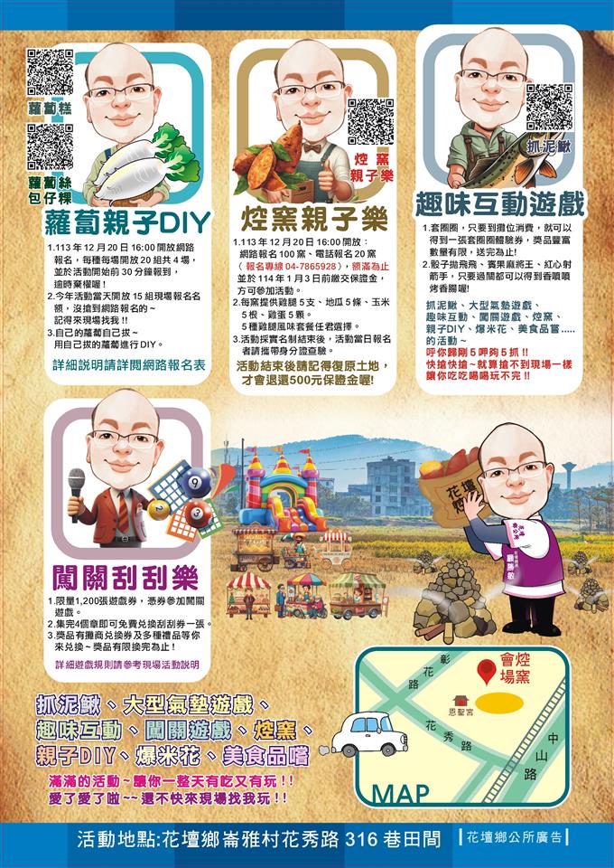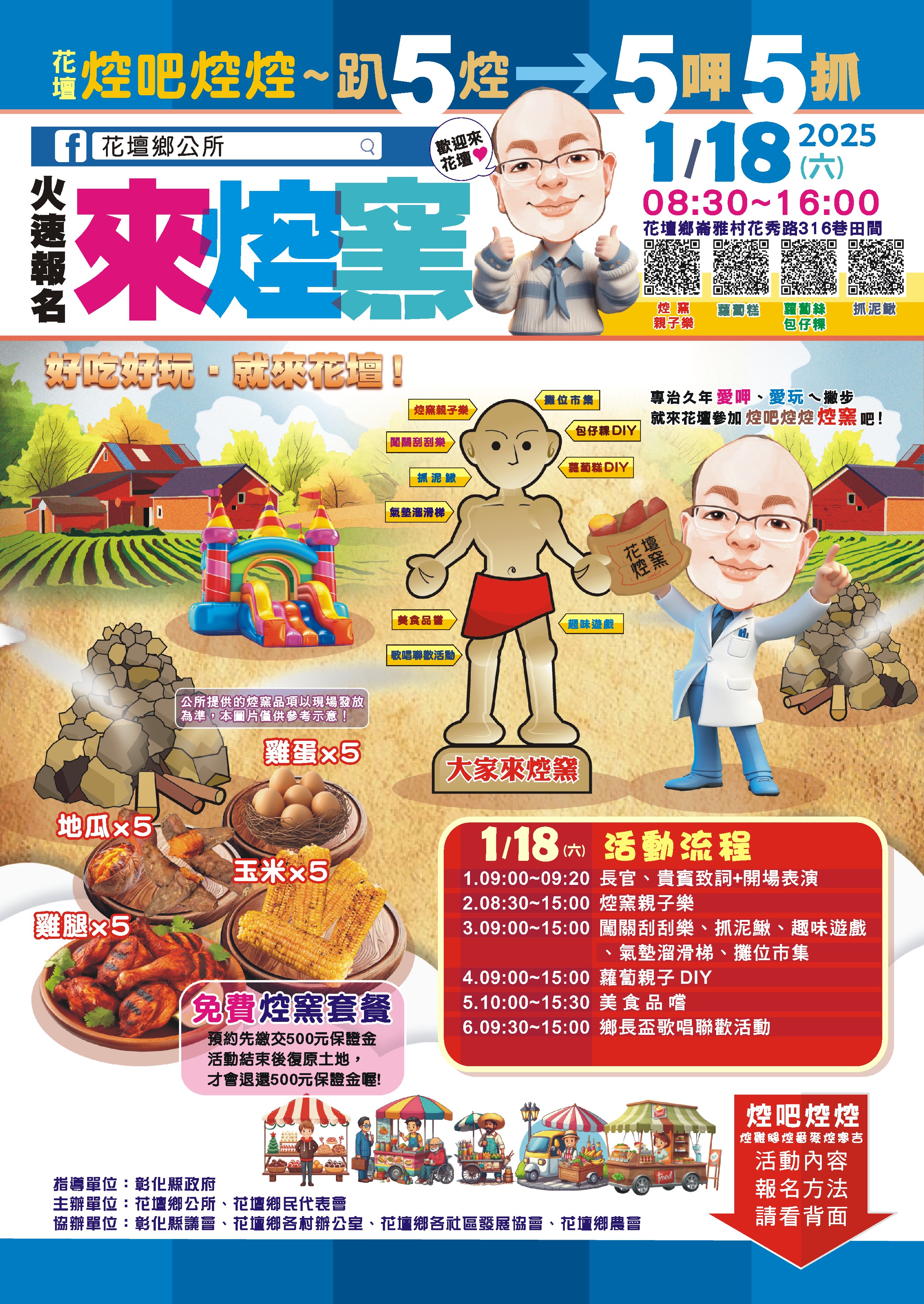 年度活動 2025花壇「焢吧焢焢~趴5焢...5呷5抓!」 歷史訊息 | 發布日期: 2024/12/10~2025/01/17 | 瀏覽人數: 1378人 | 聯絡資訊: 黃小姐 分機182 喜愛花壇『焢吧焢焢系列活動』的捧油們…阿敏鄉長聽到你們敲碗的聲音了!!2025花壇焢吧焢焢系列活動終於~~出~~來~~了~~,大家磨拳擦掌的準備好了嗎???每年都是在50秒內就定生死(不是啦!!是搶完了)~~網路報名時間是12月20日(五) 16:00準時開放..記得訂好鬧鐘+調高您的網速..加油!!今年還是有20名的電話報名名額,搶窯專線(04)7865928,同步在12月20日(五)16:00準時開通,時間未到請不要打電話喔!!遊戲方式有了一點小小的改變~~就是…我們把全雞升級成雞腿,全全攏細腿啦!除了升級雞腿~還要升級口味,所以報名時要選擇ABCDE其一方案 看你是要迷迭香還是椒麻香...任君選擇,有迷有好棒棒!!焢窯報名處: https://www.beclass.com/rid=294dae1673e9333cec84蘿蔔糕親子DIY報名處:https://www.beclass.com/rid=294dae1673e991bc6073包仔粿親子DIY報名處:https://www.beclass.com/rid=294dae1673e96f429de8抓泥鰍比賽報名處:https://www.beclass.com/rid=294dae1673e9a91b6ab5