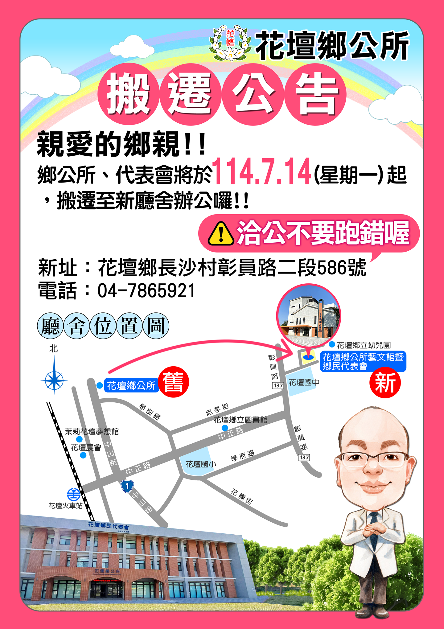 最新公告 📢📢搬遷公告|花壇鄉公所、鄉民代表會新廳舍將正式啟用囉! 發布日期: 2025/07/08~2026/02/28 | 瀏覽人數: 1534人 | 聯絡資訊: 江威翰 7865921分機206 搬遷公告|花壇鄉公所、鄉民代表會新廳舍將正式啟用囉!親愛的鄉親!! 7月13日(星期日)上午9:00舉辦花壇鄉公所暨藝文館、鄉民代表會落成啟用典禮,歡迎鄉親共襄盛舉,見證多功能文教園區的啟用鄉親請注意!!花壇鄉公所、鄉民代表會要搬家了!! 將於7/14(一)搬遷至新廳舍辦公囉!!! 114年7月14日(星期一)起,於新址正式對外辦公服務!! 新址:503004彰化縣花壇鄉長沙村彰員路二段586號 電話:(04)7865921、專線及傳真號碼均維持不變。歡迎鄉親們蒞臨新廳舍!!洽公不要跑錯了喔!! 造成不便,敬請見諒!感謝您的配合與支持!#花壇鄉公所 #花壇鄉民代表會#新廳舍 #搬遷公告 #阿敏鄉長關心您