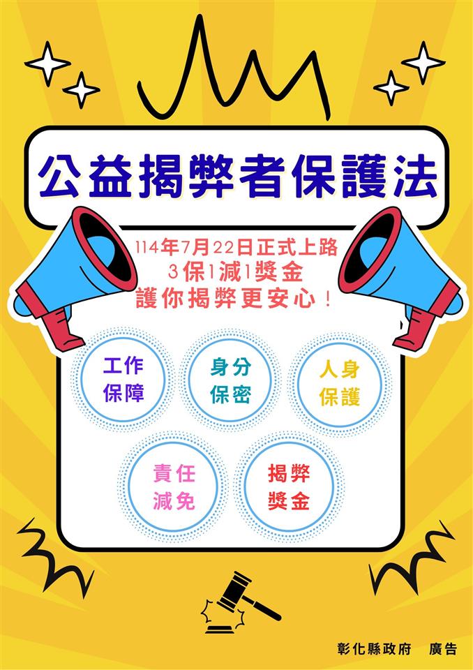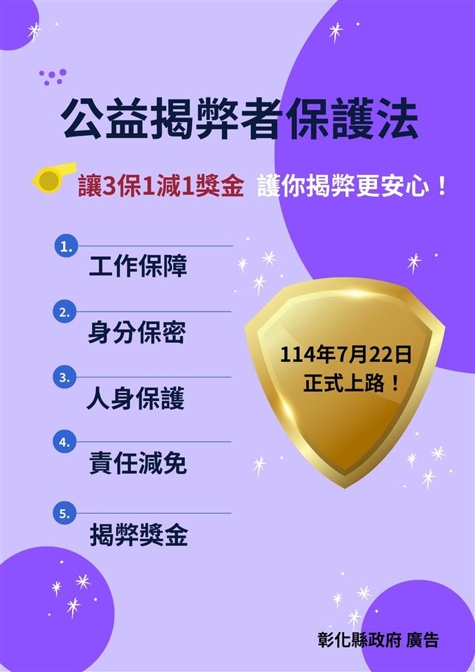 其他資訊 [宣導]公益揭弊者保護法,自114年7月22日正式施行!! 發布日期: 2025/09/05~2026/05/31 | 瀏覽人數: 86人 | 聯絡資訊: 柯孟秀 我國於2025年1月22日公布《公益揭弊者保護法》,並於同年7月22日施行, 建立國內首部揭弊保護專法可提供揭弊者安心吹哨之環境,具體落實《聯合國反貪腐公約》保護揭弊者之精神。 相關宣導文宣資料如附件,敬請參閱! 花壇鄉公所政風室