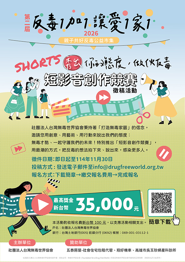 最新公告 社團法人台灣無毒世界協會舉辦「《Shorts(秀出)你的態度:做伙反毒》短影音創作競賽暨親子共好反毒市集」活動 發布日期: 2025/10/23~2025/11/30 | 瀏覽人數: 9人 | 聯絡資訊: 賴涵真 分機1203 一、活動結合2026年第二屆反毒公益市集,用創意喊話,讓世界看見你的無毒宣言!不分年齡、不限身分、單人或團隊都可以報名!二、拍出30–90秒和反毒相關的短影音,最高獎金35,000元,投稿截止時間:114年11月30日。三、頒獎典禮:115年2月28日高雄文化中心圓形廣場盛大登場!四、更多詳情請見官網(網址:https://www.dfwwedo.org.tw/)或粉絲專頁。五、活動簡章歡迎下載。