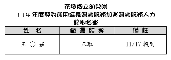最新公告 花壇鄉立幼兒園 114年度契約進用延長照顧服務加置照顧服務人力甄選結果 發布日期: 2025/11/14~2025/12/14 | 瀏覽人數: 30人 | 聯絡資訊: 吳沛淇 分機1134 花壇鄉立幼兒園114年度契約進用延長照顧服務加置照顧服務人力錄取名單公告