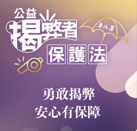 其他資訊 [宣導]公益揭弊者保護法於本年7月22日正式施行! 發布日期: 2025/11/03~2026/11/03 | 瀏覽人數: 26人 | 聯絡資訊: 柯孟秀 我國於2025年1月22日公布《公益揭弊者保護法》,並於同年7月22日施行, 建立國內首部揭弊保護專法可提供揭弊者安心吹哨之環境,具體落實《聯合國反貪腐公約》保護揭弊者之精神。 相關宣導文宣資料如附件,敬請參閱! 花壇鄉公所政風室
