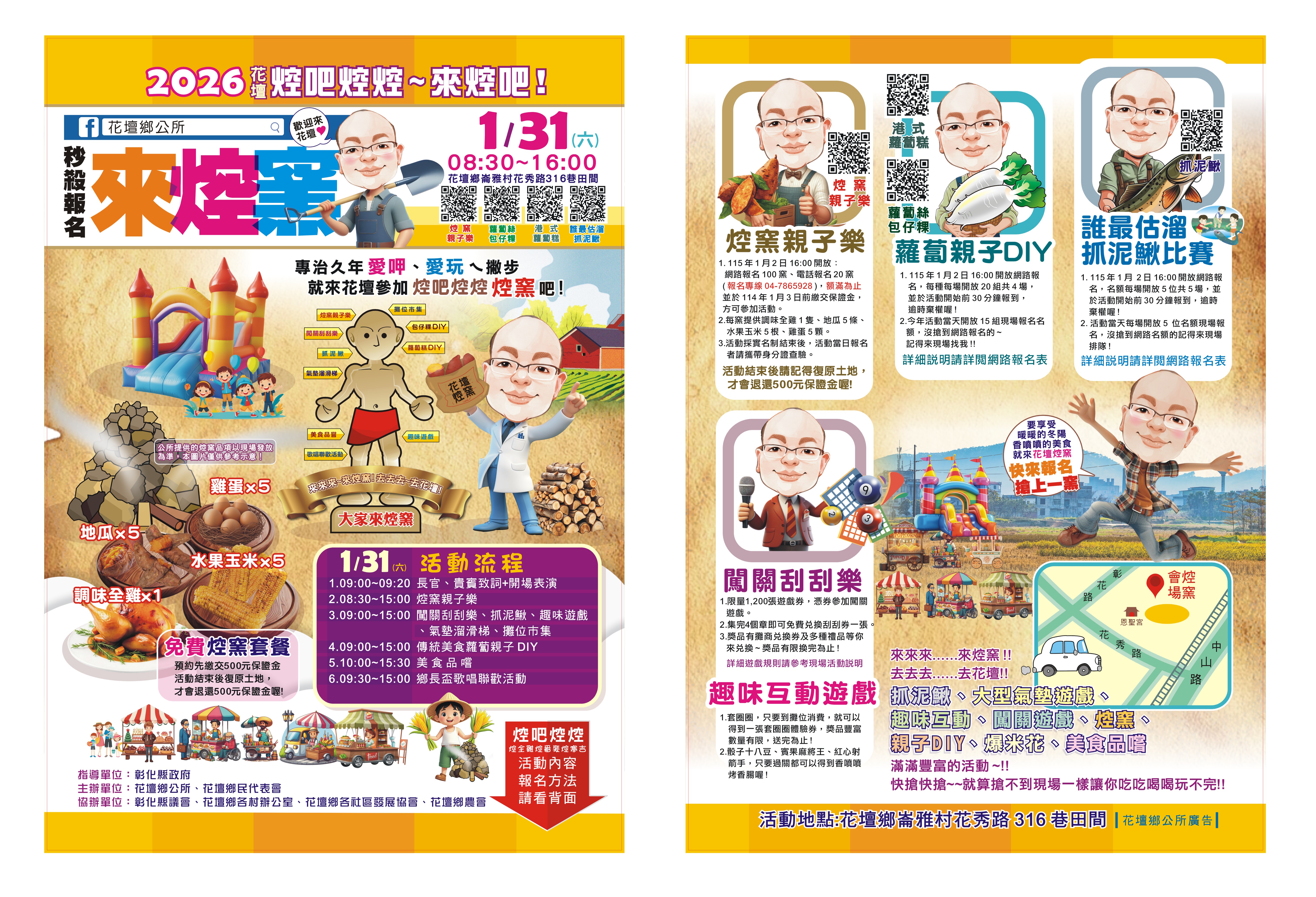 年度活動 2026花壇「焢吧焢焢~來焢吧!」活動要來囉~~~ 發布日期: 2025/12/23~2026/01/12 | 瀏覽人數: 319人 | 聯絡資訊: 分機1602 感謝大家喜愛花壇『焢吧焢焢系列活動』的捧油們…阿敏鄉長聽到你們敲碗的聲音了!!2026花壇焢吧焢焢系列活動終於~~出~~來~~了~~,大家磨拳擦掌的準備好了嗎???每年都是在50秒內就定生死(不是啦!!是搶完了)~~網路報名時間是115年1月2日(五) 16:00準時開放..記得訂好鬧鐘+調高您的網速..加油!!今年還是有20名的電話報名名額,搶窯專線(04)7865928,同步在1月2日(五)16:00準時開通,時間未到請不要打電話喔!!遊戲方式今年又有點小改變~~就是…全全攏細腿變身為一整隻雞… 還幫你把整隻咕咕雞都先醃製調味好,有迷有好棒棒!!讓我們今年再來創新高,看大家可以在多短時間內搶完100窯~~驚嚇我吧!!