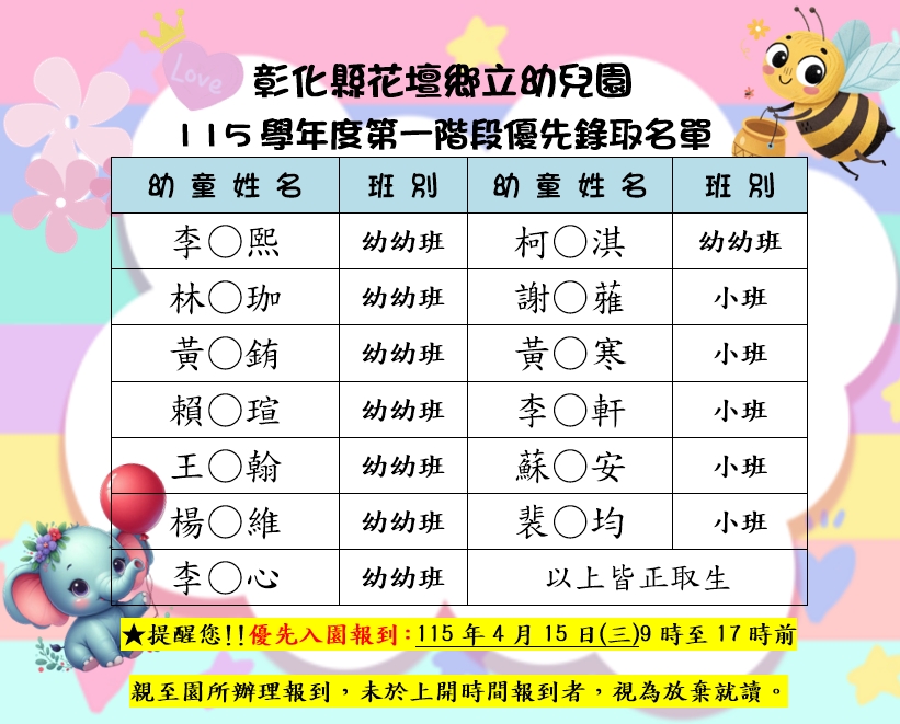 最新公告 花壇鄉立幼兒園115學年度第一階段優先入取新生錄取名單公告 發布日期: 2026/04/14~2026/05/14 | 瀏覽人數: 30人 | 聯絡資訊: 洪聖怡 分機1132 花壇鄉立幼兒園115學年度第一階段優先入取新生錄取名單公告優先入園報到:115年4月15日(三)9時至17時前親至園所辦理報到,未於上開時間報到者,視為放棄就讀。 幼 童 姓 名 班 別 幼 童 姓 名 班 別 李○熙 幼幼班 柯○淇 幼幼班 林○珈 幼幼班 謝○蕥 小班 黃○銪 幼幼班 黃○寒 小班 賴○瑄 幼幼班 李○軒 小班 王○翰 幼幼班 蘇○安 小班 楊○維 幼幼班 裴○均 小班 李○心 幼幼班
