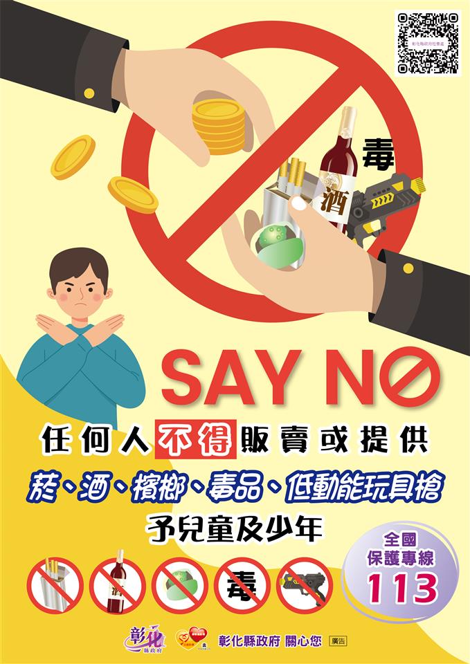 其他資訊 宣導114年彰化縣政府兒少保護暨有害身心健康物質宣導方案 「守護兒少零距離,有害物質都遠離!」 發布日期: 2025/06/09~2025/12/31 | 瀏覽人數: 72人 | 聯絡資訊: 鄭安村 04-8922117#114 宣導標語 標語1 網路世界停看聽,使用3C不沉迷 標語2 不拍攝、不分享、不持有兒少私密性影像 標語3 不菸、不酒、不毒、不吃檳榔、不玩殺傷力遊戲用槍 標語4 網路陷阱要注意,兒少幸福不剝削 標語5 如發現兒少家暴、兒虐、性侵害事件,請撥打113保護專線 標語6 無毒有我,向毒說不 標語7 守護青春齊手救援,防制兒少性剝削 標語8 遠離危害,青春才High