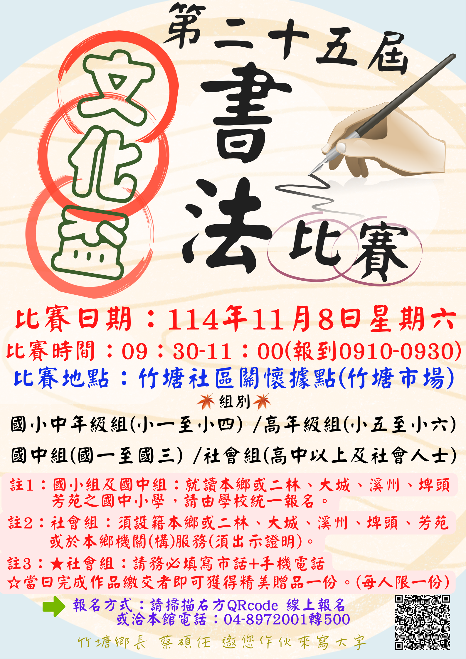 其他資訊 轉知彰化縣竹塘鄉公所辦理「第二十五屆文化盃全鄉書法比賽」活動 發布日期: 2025/10/14~2025/11/14 | 瀏覽人數: 5人 | 聯絡資訊: 顏僑志 一、比賽時間:114年11月8日星期六上午09:30至11:00分止(報到時間上午09:10-09:30)。 二、比賽地點:竹塘社區關懷據點(竹塘市場)。 三、參賽資格: (一) 國小中、高年級組及國中組:本鄉或二林、大城、溪州、埤頭、芳苑之國中小學,請由學校統一報名。 (二) 社會組:須設籍本鄉或二林、大城、溪州、埤頭、芳苑或於本鄉機關(構)服務(比賽當日須出示證明文件)。 四、報名方式:請掃描QRcode線上報名或以e-mail:ntws18@chutang.chcg.gov.tw或洽04-8972001轉500報名。 五、報名截止日期:114年11月2日星期日17時前。