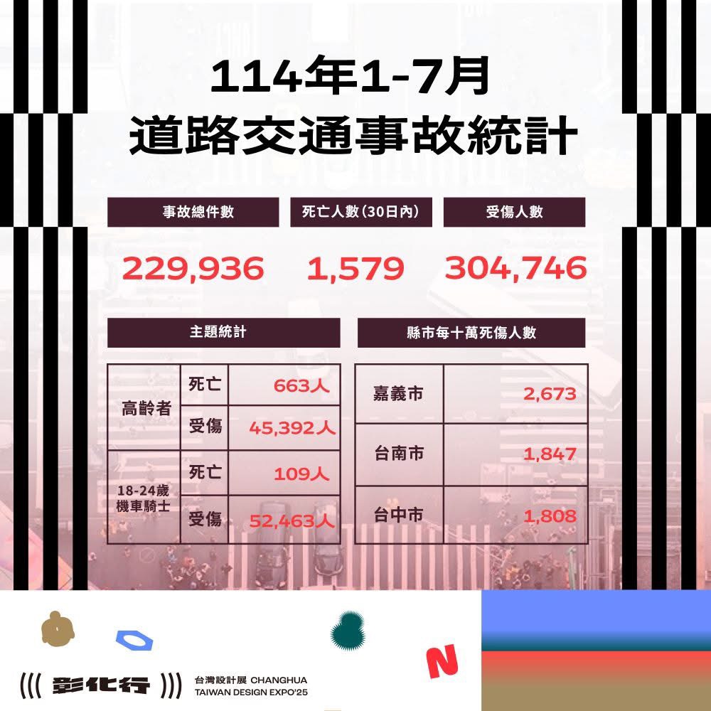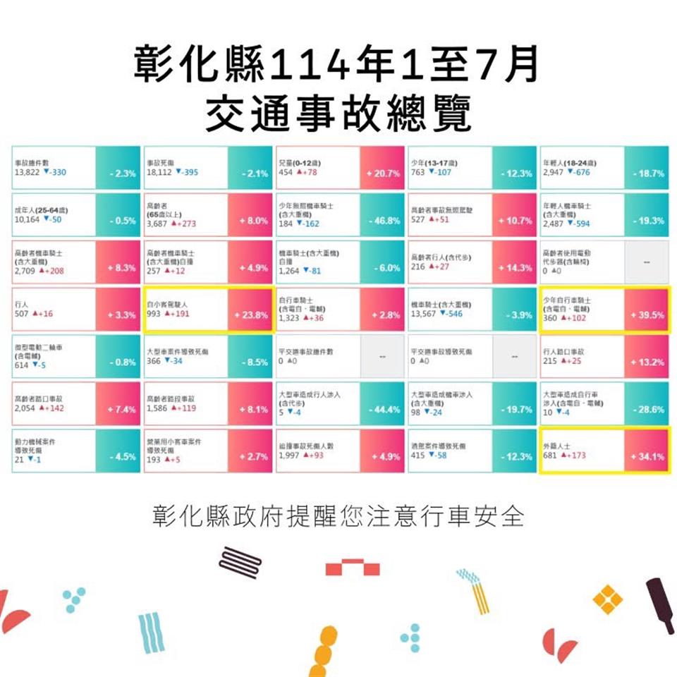 其他資訊 114年1-7月全國道路交通事故數據公布 發布日期: 2025/11/11~2025/12/11 | 瀏覽人數: 43人 | 聯絡資訊: 吳堂華 ⚠️114年1-7月道路交通事故 彰化縣事故死傷累計18,112人, 依道安資訊查詢網顯示跟112年同期比較,死傷人數當中 #少年自行車騎士(含電自、電輔) 事故增加39.5%最高, #外籍人士事故 增加34.1%次之, #自小客車駕駛人 增加23.8%再次之。 提醒大家,務必注意用路安全! 🟣自行車左轉請小心,兩車道以上請兩段左轉,安全不搶快。 🟣Safety First: Yield and Stop at Intersections! 🟣開車專心看路,別讓手機帶路。 👉更多資訊可上道安資訊查詢網( https://roadsafety.tw/)