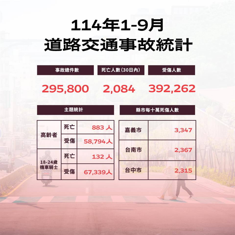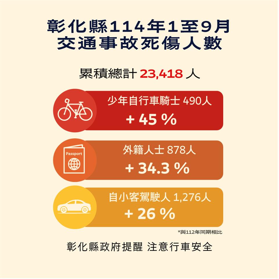 其他資訊 📢🆕最新交通事故數據公布 發布日期: 2025/12/26~2026/01/26 | 瀏覽人數: 46人 | 聯絡資訊: 吳堂華 ⚠️114年1-9月道路交通事故 彰化縣事故死傷累計23,418人,依道安資訊查詢網顯示跟112年同期比較,死傷人數當中 #少年自行車騎士(含電自、電輔) 事故增加45%最高, #外籍人士事故 增加34.3%次之, #自小客車駕駛人 增加26%再次之。 提醒大家,務必注意用路安全! 🟣分心騎車有風險,左轉停看更安全 🟣At Unsignalized Intersections: Stop, Look, and Yield. 🟣多一分禮讓,少一分遺憾,路口不搶快,安全自然來 👉更多資訊可上道安資訊查詢網( https://roadsafety.tw/)