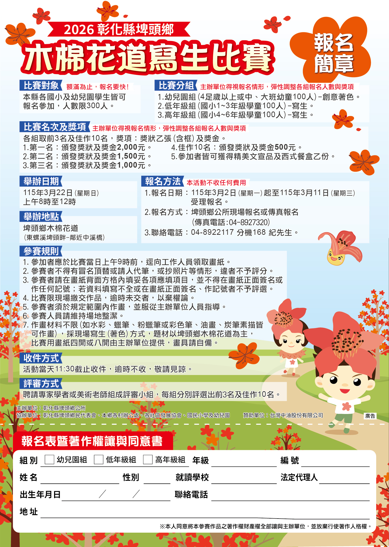 其他資訊 2026彰化縣埤頭鄉木棉花道寫生比賽活動訊息公告 發布日期: 2026/02/06~2026/03/06 | 瀏覽人數: 70人 | 聯絡資訊: 紀佑澤 04-8922117#168 迎接全台最長最美的埤頭鄉木棉花道花季~爆開序幕! 2026彰化縣埤頭鄉木棉花道寫生比賽 時間:115年3月22日(星期六)上午8-12時 地點:埤頭鄉木棉花道(鄰近中溪橋) 組別:主辦單位得視報名情形,彈性調整各組報名人數與獎項 幼兒園組(4足歲以上或中、大班100人)-塗鴉著色 低年級組(國小1-3年級學童100人)-寫生 高年級組(國小4-6年級學童100人)-寫生 參加人員可獲得精美文宣品及西式餐盒乙盒 報名時間:115年3月2日起至3月11日止受理報名(額滿300人截止) 報名方式:填報報名表親送埤頭鄉公所社會課或傳真報名(傳真電話:04-8927320)