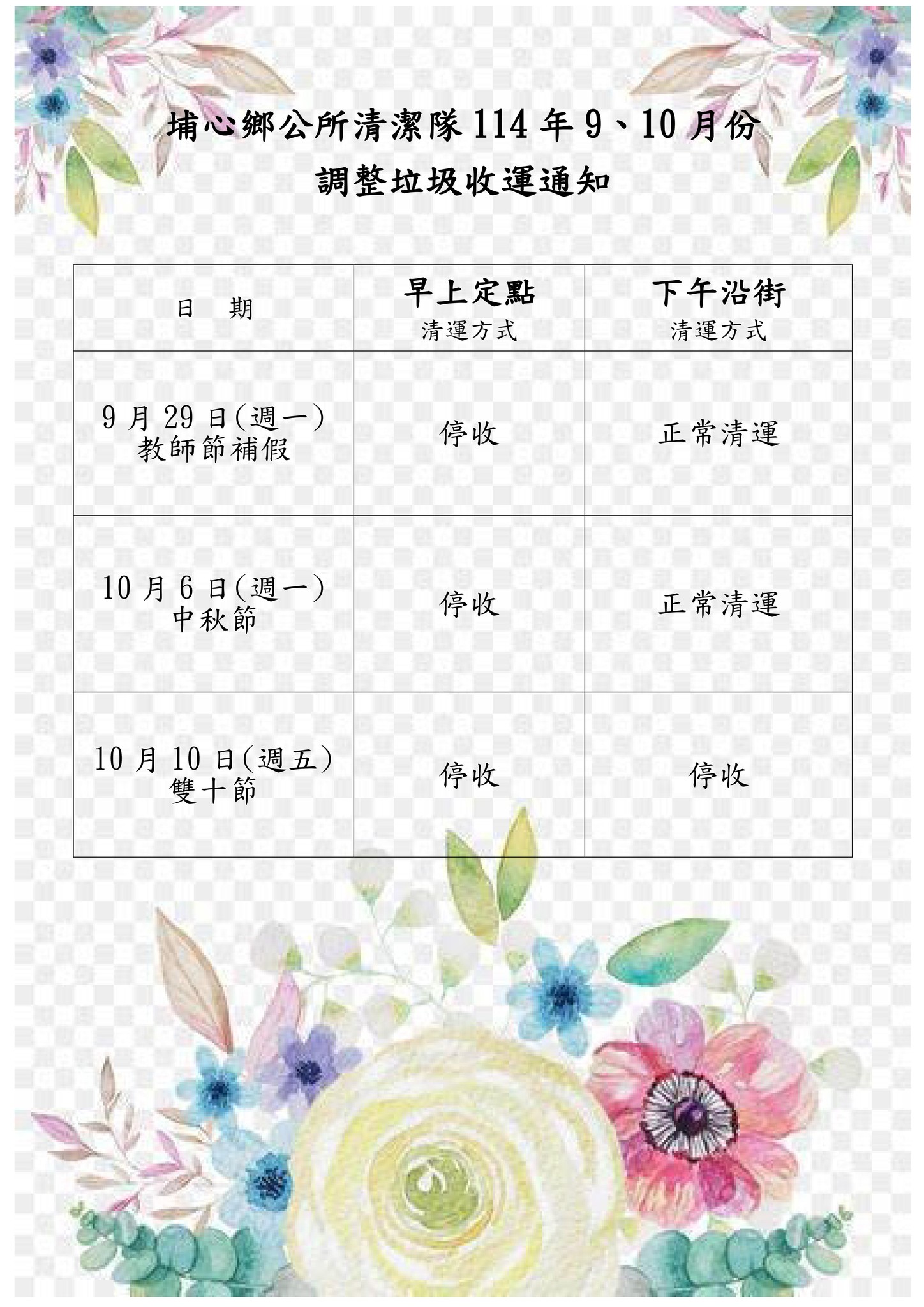 最新公告 埔心鄉公所清潔隊114年9、10月份調整垃圾收運通知 發布日期: 2025/09/08~2025/10/17 | 瀏覽人數: 10人 | 聯絡資訊: 清潔隊 04-8296249分機60 114年9月29日(一)教師節補假,早上定點停收垃圾,下午正常沿街收運垃圾。114年10月6日(一)中秋節,早上定點停收垃圾,下午正常沿街收運垃圾。114年10月10日(五)雙十節,早上定點及下午皆停收垃圾。
